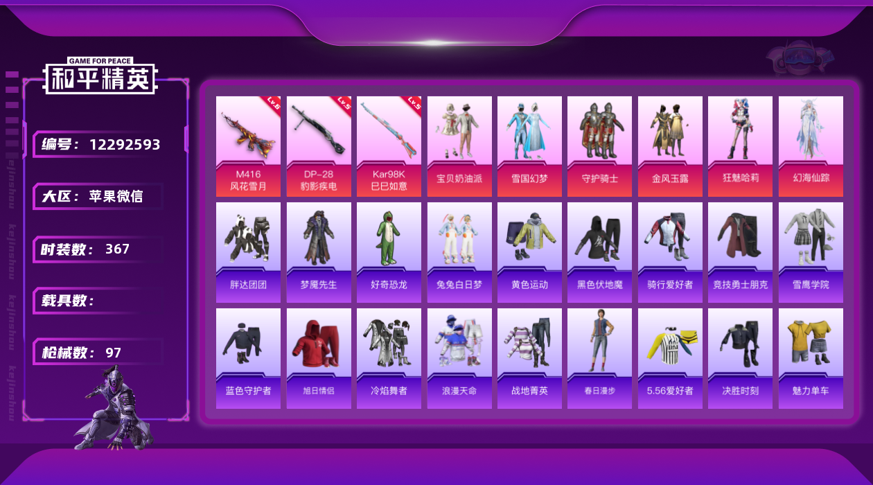 [12292593]6粉装 3特效枪 4印记 可二次 可修改实名 女号 优质装备:雪国幻梦(冰雪女王),守护骑士,金风玉露,宝贝奶油派,M416风花雪月,幻海仙踪,狂魅哈莉,Kar98K-巳巳如意 热门装扮:兔兔白日梦,胖达团团,梦魇先生,好奇恐龙 稀有枪皮:DP-28-豹影疾电 六级特效枪:六级M416-风花雪月 五级特效枪:五级Kar98K-巳巳如意,五级DP-28-豹影疾电 紫色装扮:SS31特训套装,云朵鹅,雪绒豹,SS33特训套装,旭日情侣,顶瓜瓜,混沌火种,北国孤狼,圣诞大吉,坚韧舞者,夜莺强袭者,凛冬战士,SS4特训,5.56爱好者,SS2特训,SS3特训,SS5特训,冷焰舞者,冰原使者,,决胜时刻,SS14特训,战地菁英,骑行爱好者,魅力单车,黄色运动,黑色伏地魔,熔岩游骑兵连帽夹克,金鼠迎春,酷潮明星,雪山征服者,雪山精英,雪鹰学院,无面战甲,牛气满满,深蓝色名流,狂战萌兔,跃动心情,缤纷果语,耀动青春,蓝色守护者,狂沙舞者,疯狂小兔子,竞技勇士朋克,异域银装,浪漫天命,迷域探索者,精神漫游,核芯基因,SS7特训,摇滚狂鲨,云丝凤蟒,清香五月粽,SS8特训,顽皮玉兔,SS9特训,太极红客,折纸暴龙,浴火魔神,炽焰拳师,格斗专家,SS6特训,五号元素,耀粉歌者,星渊小夜曲,维京奇缘,春日漫步,萌黄之夏,SS32特训服(SS32特训套装),鲛海歌灵,紫幽梦,蓝冰羽,粉恋花,黑夜传说,幻世猎手,森林猎手,初雨海棠,丛林猎人,传奇侦探 优质战备:华贵君王降落伞,幻彩电音降落伞,湮灭星辰降落伞,金风玉露降落伞,雪国幻梦降落伞,天启纪元降落伞,深海曼妙降落伞