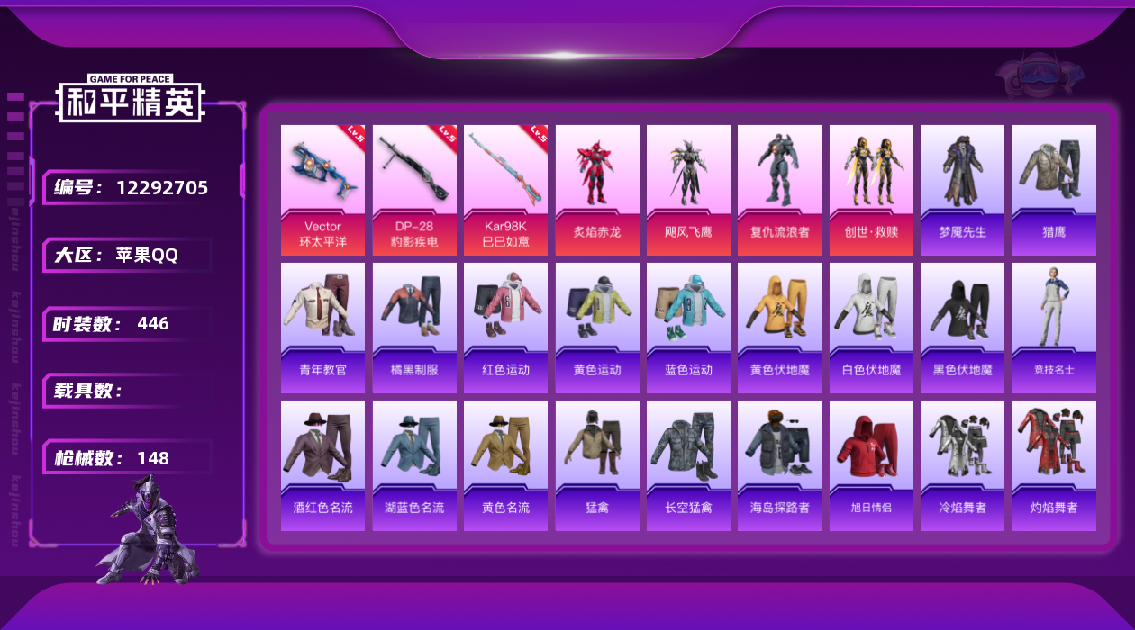 - PX_2083279- 苹果手Q-13王牌印记-14粉装-8特效枪-1载具-85013热力值-199套装-248枪皮-1卓越印记-1传奇印记 【14粉装】,2号机款机体服,甜心巧克力,宝贝奶油派,天使彩虹糖,千金淑猫,拂晓神骑,星云暗核,智能音符,圣堂之誓,林间仙鹿,彩虹鹿灵,山涧鹿灵,创世·救赎,电磁星 【8特效枪】AKM-炫紫旋律-7级 AKM-绿萝繁花-5级 SCAR-L-青春物语-7级 M