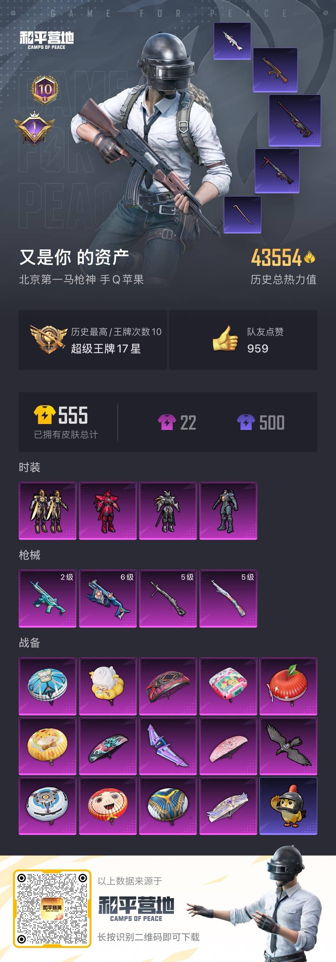 - [11702752]苹果q 极品🆔雅观 实名: 可修改 时装数: 1517 载具数: 3 枪械数: 562 战备数: 383 神级装扮: 沙丘之主-图卡盟,圣域龙灵-瑞拉 热门装扮: 奇异狩猎者,梦幻火箭(新101),极限特训,幻影战神,甜心巧克力,怪诞乔克,深海小丑鱼,星之信仰,深渊皇后,金风玉露,宝贝奶油派,浪漫波比,天使彩虹糖,梦魇先生,放客神游,金属狂野,静灵氛围,鹰眼刺客,缤纷油彩,爱崽白熊,粉色回忆,都市猎人,暗翼战神,黄伞悠悠,绚金战神,草莓生巧,炙焰红王,花间之火,冰霜白皇,精灵迷巫,潮汐统领,童趣迷兔,迷蝶贵族,雪国幻梦,俏皮狐尾,星空之魅,山涧鹿灵,相思残雪,馨动时刻,迪迦闪耀型,冥河战士,蜜桃特工,彩虹鹿灵,俏雪含霜,洛天依,蓝莓炮弹,精灵娃娃,酣梦娃娃,甜心娃娃,焦糖拿铁,百合蜜语,甜梦小狐,筑梦精灵,圣光天使,霞光圣骑,寒光使者,妙趣可丽,暖熊萌萌,复仇流浪者,绒雪飘舞,垂柳戏鸭,灵感创作师,彩虹甜喵,女娲后裔-赵灵儿,甜蜜草莓,旋转彩虹,冰川粉黛,冰川红玫,冰川幽秘,潮萌小黄鸭,大橘为重,恶魔喵喵,激萌罗小黑,罗小黑,萌神柯基,奶芙汪汪,胖达团团,奇迹天团,软萌银虎,神秘黑猫,动感兔斯基,兔兔白日梦,启明星,音爆索尼克,派对舞王,仲夏莫吉托,雪梅暗香,诡夜天鹅,第五大道,飒粉甜心,小可学妹,白勺歌姬,呆萌星弥,南国舞曲,未来歌姬,闲梦青缨,傲傲奶龙,镜光幻境,蜜语绒猫,严莉莉,美雪,美琪,小蓝,千金淑猫,樱桃泡泡,智耀战神,星穹咏叹调,荧海星豚 载具: 特斯拉Model 3(冷光银),护世瑞兽,晶梦灵驹,僚机-圣域龙宝 稀有枪皮: MG3洛神天依,M762甜蜜誓约,AKM炫紫旋律,SCAR-L梦幻火箭,AKM甜心宝贝,AWM花间之火,M416心之恋语,M416全功率超战,SCAR-L童趣迷兔,AUG星之彼岸,汤姆逊怪笑疯兔,M249蓝莓炮弹,GROZA焦糖拿铁,UMP45恐龙拽拽,SCAR-L甜梦小狐,UZI筑梦精灵,AUG妙趣可丽,M16A4垂柳戏鸭,M249彩虹甜喵,P90甜蜜草莓,GROZA旋转彩虹,M417第五大道,Vector飒粉甜心,Kar98K未来歌姬,平底锅仲夏莫吉托,M416超新星,M24莲影清波,PKM江南烟雨,AMR鸢尾晶梦,AKM-幽焰骑士,DP-28-千金淑猫,Kar98K-巳巳如意,SCAR-L金蛇镇世,破片手榴弹-热量炸弹,MK14-樱桃泡泡,Fa