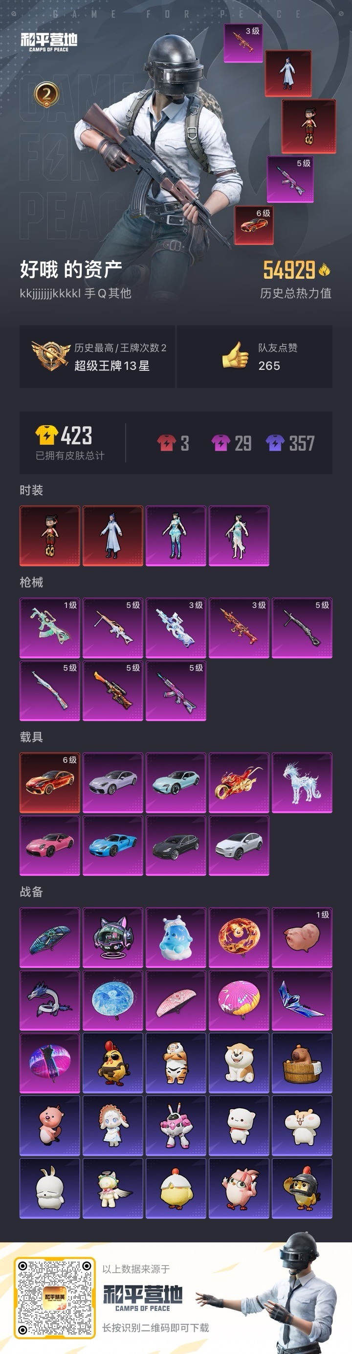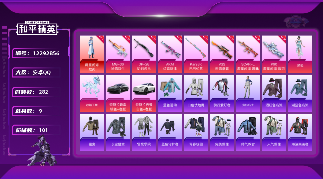 [12292856]2红装 2粉装 8特效枪 9载具 2印记 可二次 可修改实名 优质装备:一级魔童闹海-敖丙,魔童闹海-敖丙,特斯拉Model 3(冷光银),特斯拉Model X(珍珠白),AKM炫紫旋律,VSS烈焰拳霸,灵玺,Kar98K-巳巳如意 载具:冰绡玉鳞 稀有枪皮:MG-36-沧焰双生,P90-魔童闹海 敖丙,SCAR-L-魔童闹海 哪吒,DP-28-豹影疾电 五级特效枪:五级Kar98K-巳巳如意,五级Kar98K-伏魔团,五级DP-28-豹影疾电,五级MG-36-沧焰双生,五级VSS-烈焰拳霸 三级特效枪:三级P90-魔童闹海 敖丙,三级SCAR-L-魔童闹海 哪吒 紫色装扮:极速光影,SS30特训套装,SS31特训套装,SS33特训套装,夏日音浪,完美偶像,帅气教官,幻世战舞者,人气偶像,SS17特训,萌趣颜团子,特种颜团子,暗夜傀儡,SS21特训,SS20特训,SS18特训,SS19特训,骑行爱好者,香桃花海,青涩年华,酒红色名流,长空猛禽,青春校园,雪鹰学院,炫蓝之夏,湖蓝色名流,格斗先锋,海滨突袭者,蓝色守护者,蓝色运动,白色伏地魔,猛禽,疯狂小兔子,碟中谍A款,福星高照,星途旅人,燕燕于飞,巳巳如意,森林游猎者,智谋强哥,旋风灵鼠,鱼渊荷华,石蕴玉辉,青团波波,糖糖葫芦,竞技名士,迷域探索者,人鱼之吻,摇滚狂鲨,深蓝冒险家,SS8特训,众神之王,智慧之神,SS9特训,耀粉歌者,绯格组合,青玉碎影,SS32特训服(SS32特训套装),恋语绒绒 优质战备:飞天猪飞行器,临安公主降落伞,飞行器-炫紫旋律,炫紫旋律降落伞,暗夜玫瑰降落伞,蓝莓炮弹降落伞