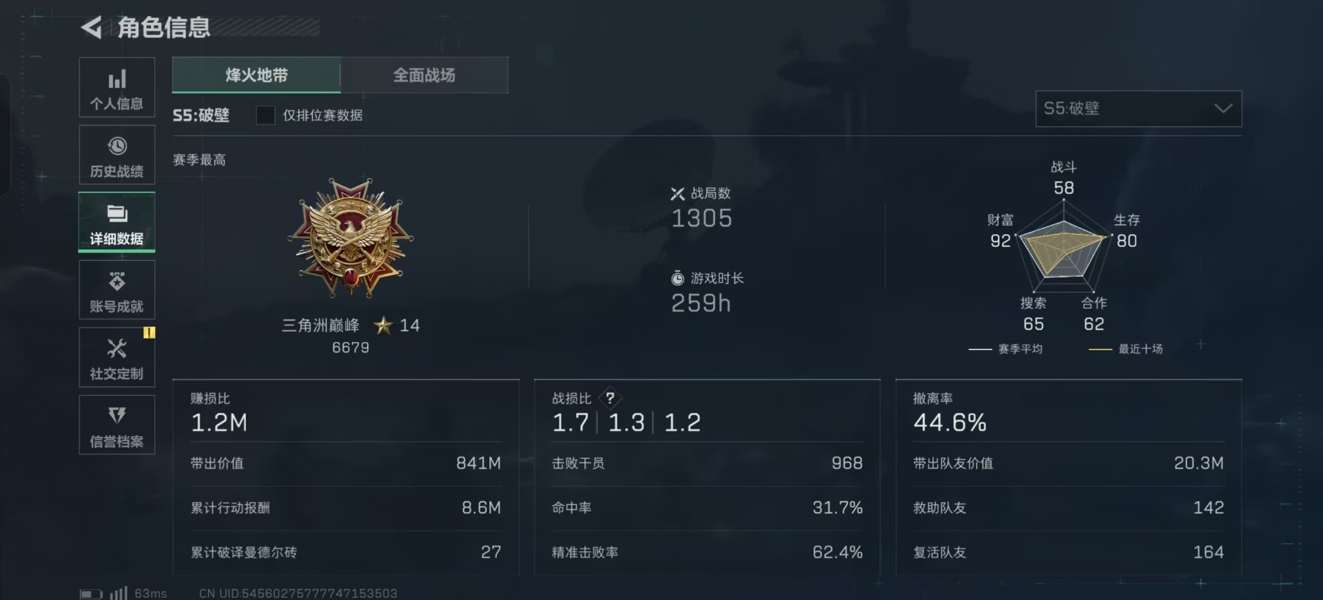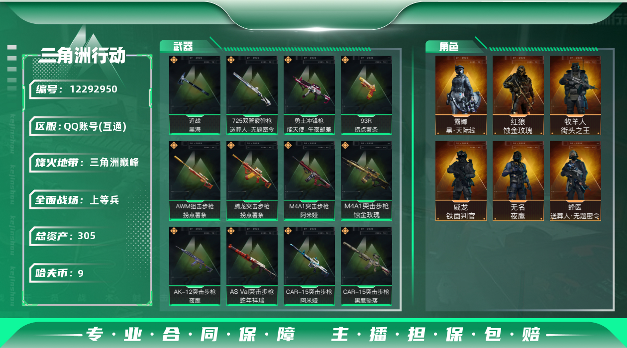 [12292950]总资产:305.7M 6干员外观 1近战传说 19传说枪械 哈夫币:9.955K 可二次 可修改实名 优质装备:近战-黑海,顶级安全箱(3x3) 烽火地带段位:三角洲巅峰 全面战场段位:上等兵 传说武器皮肤:AS Val突击步枪-蛇年祥瑞,SR-25射手步枪-水墨云图,AK-12突击步枪-夜鹰,SMG45冲锋枪-骑士,M4A1突击步枪-阿米娅,CAR-15突击步枪-阿米娅,复合弓-黑-天际线,AWM狙击步枪-捞点薯条,腾龙突击步枪-捞点薯条,93R-捞点薯条,勇士冲锋枪-能天使-午夜邮差,725双管霰弹枪-送葬人-无题密令,MP5冲锋枪-黑海,QJB201轻机枪-黑海,M7战斗步枪-维京,M4A1突击步枪-蚀金玫瑰,QBZ95-1突击步枪-破军,CAR-15突击步枪-黑鹰坠落 史诗武器皮肤:SR-3M紧凑突击步枪-英雄,M700狙击步枪-蝮蛇,G3战斗步枪-战场英杰,PKM通用机枪-守夜人,AS Val突击步枪-尖端治疗,M700狙击步枪-守夜人,SG552突击步枪-尖端治疗,SR-25射手步枪-尖端治疗,PKM通用机枪-荒野求生,勇士冲锋枪-深海恐惧,AKM突击步枪-林中猎手,.357左轮-幸运时刻,SR-3M紧凑突击步枪-荒野求生,M1014霰弹枪-林中猎手,SV-98狙击步枪-林中猎手,PTR-32突击步枪-英雄,SVD狙击步枪-荒野求生,M250通用机枪-囚徒,SV-98狙击步枪-囚徒,腾龙突击步枪-无垢,PSG-1射手步枪-无垢,M700狙击步枪-阿萨拉工艺,M14射手步枪-黑鹰坠落,沙漠之鹰-曙光,Vector冲锋枪-阿萨拉文明,SVD狙击步枪-阿萨拉工艺,PKM通用机枪-英雄,M700狙击步枪-竞技风,93R-博士 干员外观:威龙-铁面判官,红狼-蚀金玫瑰,牧羊人-街头之王,无名-夜鹰,蜂医-送葬人·无题密令(S5),露娜-黑·天际线