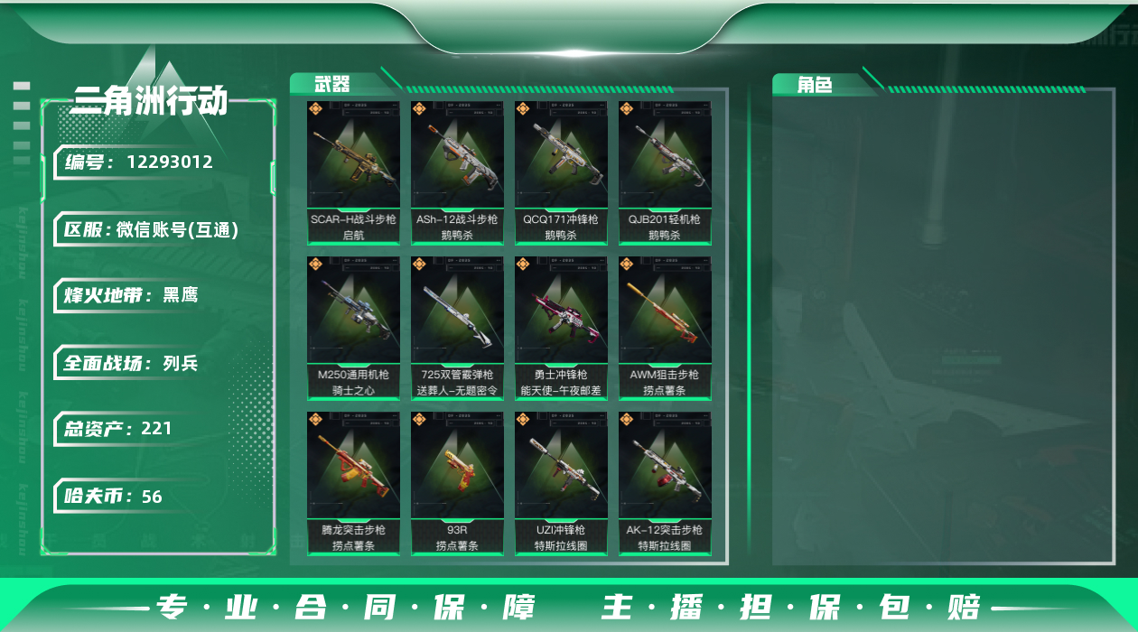[12293012]总资产:221.3M 18传说枪械 哈夫币:56.248K 可二次 可修改实名 烽火地带段位:黑鹰 全面战场段位:列兵 传说武器皮肤:SCAR-H战斗步枪-水墨云图,M250通用机枪-骑士之心,SCAR-H战斗步枪-启航,ASh-12战斗步枪-鹅鸭杀,QCQ171冲锋枪-鹅鸭杀,QJB201轻机枪-鹅鸭杀,勇士冲锋枪-能天使-午夜邮差,725双管霰弹枪-送葬人-无题密令,CAR-15突击步枪-阿米娅,复合弓-黑-天际线,UZI冲锋枪-特斯拉线圈,AWM狙击步枪-捞点薯条,腾龙突击步枪-捞点薯条,93R-捞点薯条,AK-12突击步枪-特斯拉线圈,SR-3M紧凑突击步枪-特斯拉线圈,SMG45冲锋枪-骑士,AK-12突击步枪-夜鹰 史诗武器皮肤:腾龙突击步枪-猎鳄行动