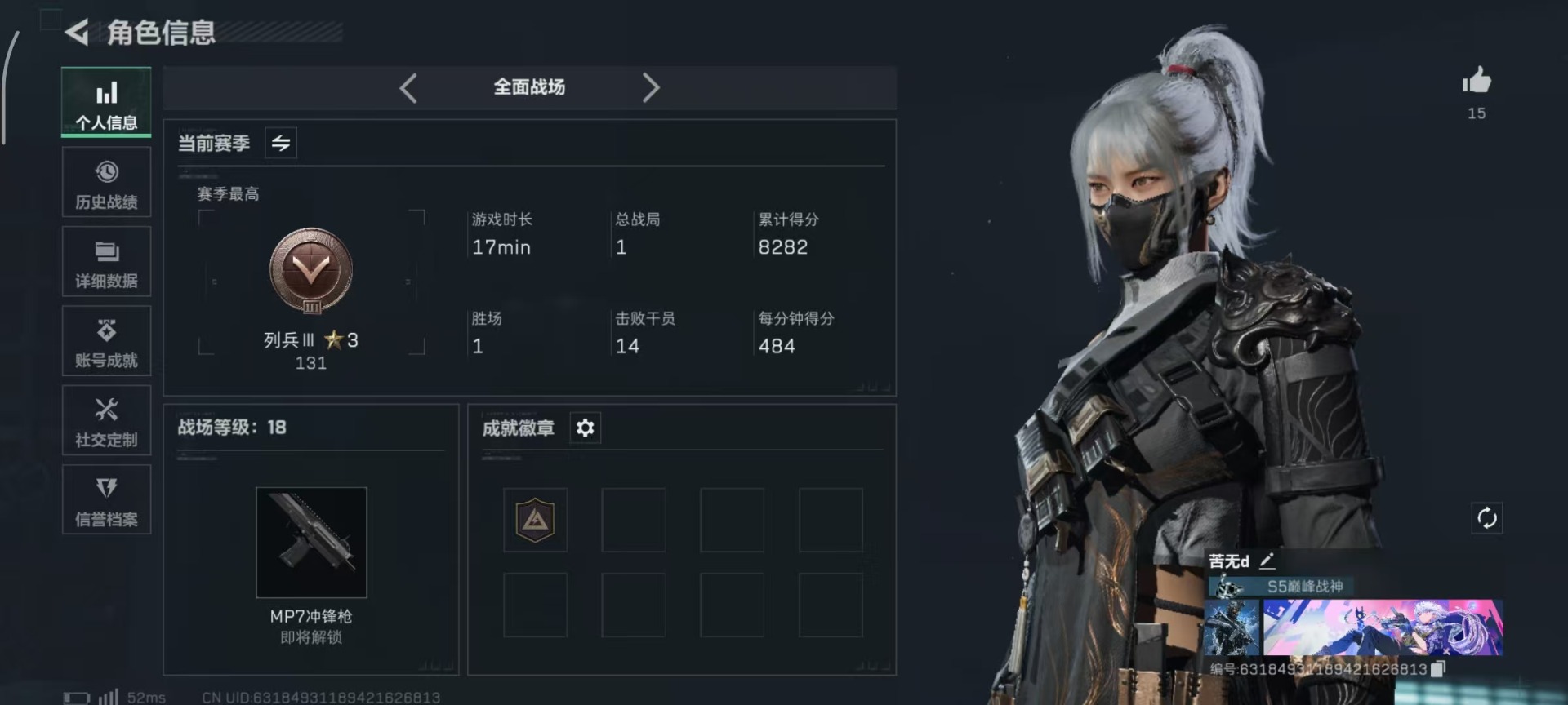 - [10848816]实名: 可修改 时装数: 404 枪械数: 117 战备数: 82 热门装扮: 未来战士,梦魇先生,大橘为重 稀有枪皮: DP-28暗夜鎏金