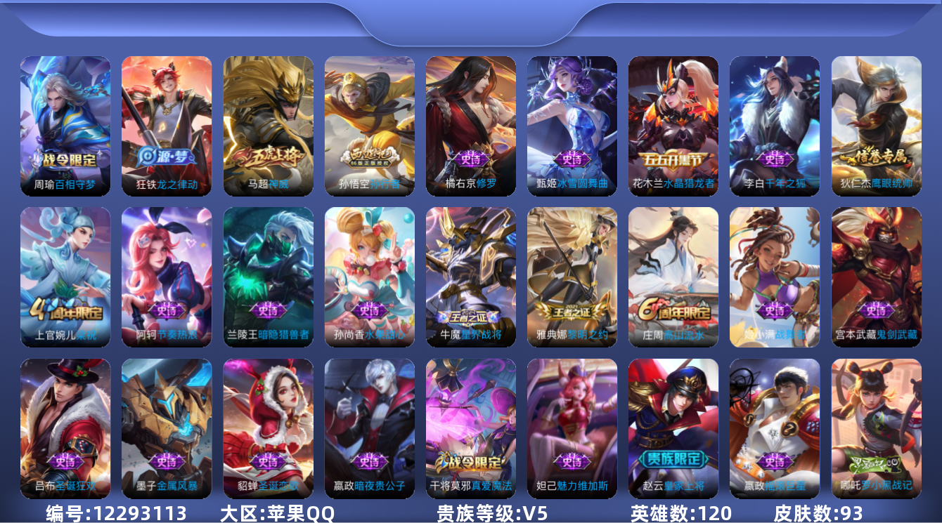 [12293113]V5 120英雄 93皮肤 可修改实名 限定皮:神威(电光马子),高山流水,梁祝,孙行者 史诗皮:龙之律动,百相守梦-周瑜,战舞者,星界战将,千年之狐,节奏热浪,修罗,摇滚巨星,水果甜心,暗隐猎兽者,鬼剑武藏,水晶猎龙者,金属风暴,圣诞狂欢,圣诞恋歌,鹰眼统帅,暗夜贵公子,魅力维加斯,黎明之约