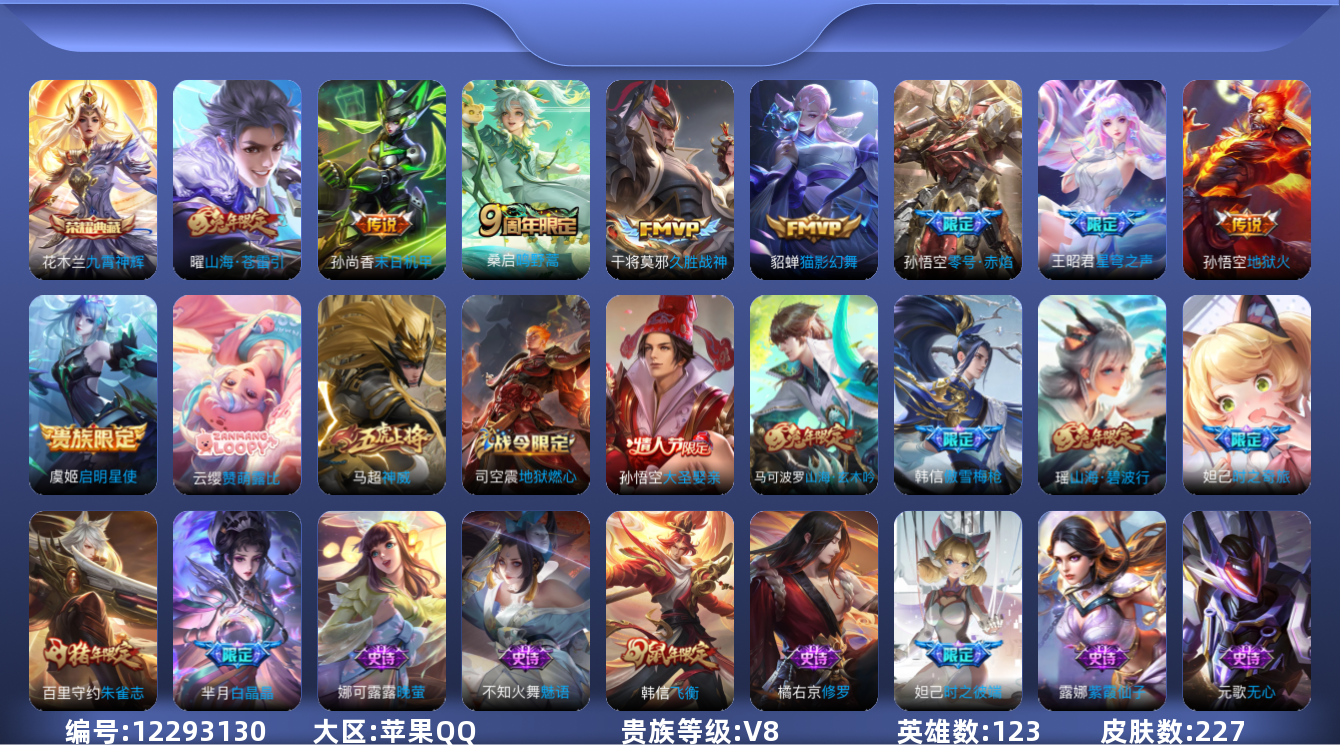 [12293130]V8 1典藏 9传说 123英雄 227皮肤 可修改实名 优质装备:九霄神辉(木兰典藏),猫影幻舞,久胜战神,末日机甲-孙尚香(绿蚂蚱),地狱火,零号·赤焰,山海·苍雷引(电光曜子) 珍宝阁皮:优雅恋人 限定皮:鸣野蒿,傲雪梅枪,星穹之声,时之彼端,白晶晶,神威(电光马子),飞衡(韩信年限),山海·碧波行(瑶年限),瑞麟志(木兰年限),五谷丰年,梁祝,逐梦之音,逐梦之影,朱雀志(守约年限),如梦令-后羿,大圣娶亲,时之奇旅-妲己,梦圆繁星,山海·玄木吟(马可年限) 史诗皮:赞萌露比,琥珀纪元伽罗,紫霞仙子,白龙吟,特工魅影,千年之狐,江河有灵,百解令(蒙犽),高渐离燃音魔法,晚萤,魅语,无限星赏官,冰冠公主,青蛇,偶像歌手,猫狗日记-孙策,修罗,女仆咖啡,水果甜心,绅士熊喵,星夜王子,心灵骇客,德古拉伯爵,暗隐猎兽者,幽灵船长,鬼剑武藏,纤云弄巧,繁星吟游(呼啦呼啦),拒霜思,缤纷独角兽,乘风破浪,水晶猎龙者,曙光守护者,金属风暴,原初追逐者,圣诞狂欢,鹰眼统帅,暗夜贵公子,奇遇舞章,无心