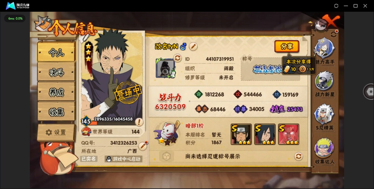 [12293797]V9 11S忍 23A忍 16通灵 632W战力 可二次 可修改实名 优质装备:千手柱间「秽土转生」,宇智波鼬「秽土转生」,宇智波斑 「木叶创立」,迈特凯「死门」,宇智波带土 「忍界大战」,宇智波斑「秽土转生·解」 S级忍者:自来也 「舞之豪杰」,宇智波鼬 「须佐能乎」,佩恩「天道」,波风水门,大蛇丸