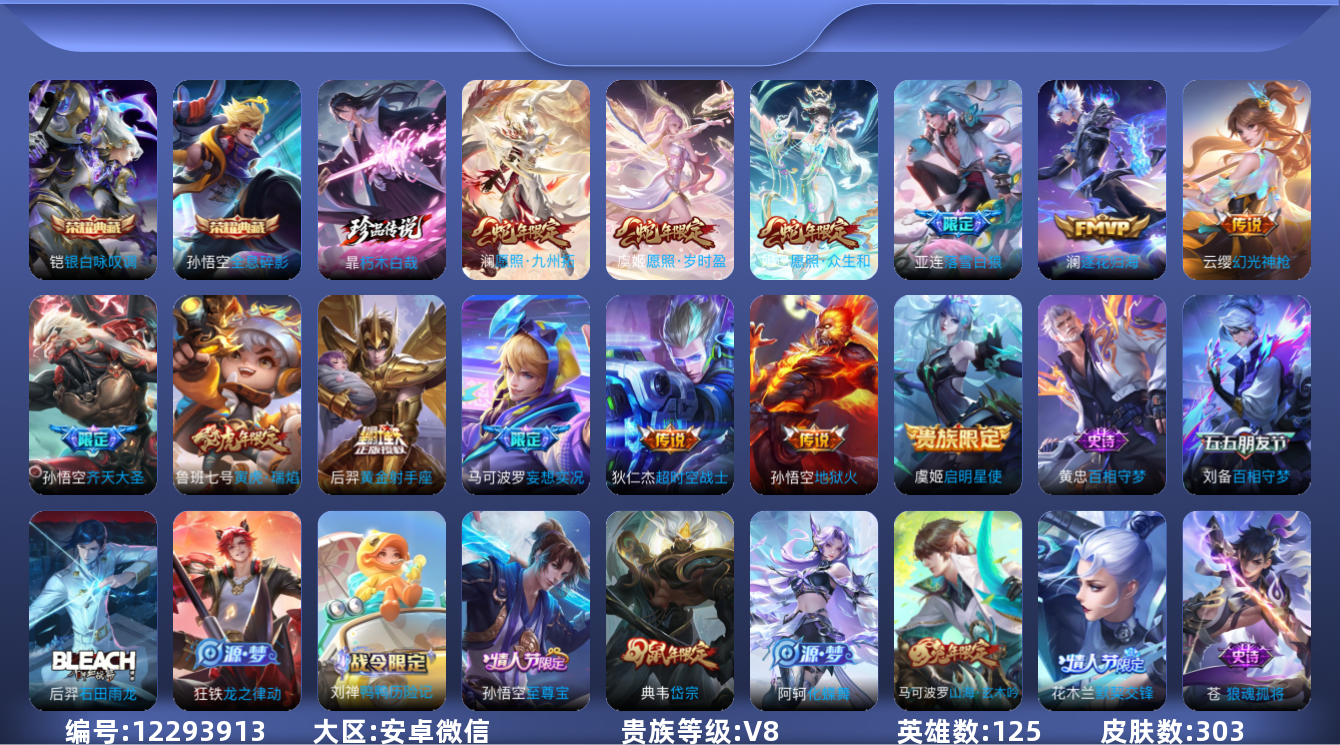 [12293913]V8 2典藏 1珍品传说 13传说 125英雄 303皮肤 可修改实名 优质装备:全息碎影(猴子典藏),银白咏叹调(倪克斯侍卫),朽木白哉,黄金射手座,地狱火,超时空战士-狄仁杰,妄想实况,澜逐花归海 传说皮:落雪白狼,幻光神枪 珍宝阁皮:万物之道,优雅恋人 限定皮:愿照·九州拓(澜年限),愿照·岁时盈(虞姬年限),愿照·众生和(妲己年限),至尊宝,飞衡(韩信年限),遇见飞天,高山流水,齐天大圣,游园惊梦,梁祝,御风骁将(吕布年限),龙胆,岱宗(典韦年限),天狼溯光者,天狼征服者,李小龙,默契交锋-花木兰,猪悟能,寅虎·瑞焰(虎皮蛋子),山海·玄木吟(马可年限) 史诗皮:鸭鸭历险记-刘禅,器灵·浮梦炉,狼魂孤将,化蝶舞,星界战将,龙之律动,石田雨龙,茶境仙,琥珀纪元伽罗,百相守梦-黄忠,苍穹之光,电玩小子(小书包),黄金分割率,特工魅影,千年之狐,江河有灵,百解令(蒙犽),高渐离燃音魔法,蒙恬荣光圣徽,无限星赏官,青蛇,偶像歌手,晚萤,电玩·爆裂旋风,百相守梦(刘备),百相守梦(关羽),乱世虎臣,节奏热浪,修罗,女仆咖啡,水果甜心,星夜王子,心灵骇客,功夫厨神,暗隐猎兽者,幽灵船长,鬼剑武藏,心灵战警,舞动绿茵,地狱岩魂,纤云弄巧,繁星吟游(呼啦呼啦),拒霜思,缤纷独角兽,乘风破浪,逐浪之夏,水晶猎龙者,曙光守护者,金属风暴,原初追逐者,圣诞狂欢,圣诞恋歌,鹰眼统帅,魅力维加斯,无心,未来纪元-赵云,玫瑰异探