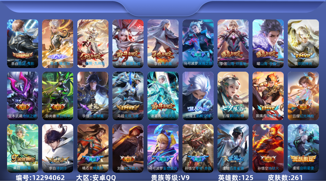 [12294062]实名: 可修改 贵族等级: V9 英雄数: 125 皮肤数: 261 荣耀水晶: 鸣剑·曳影 无双皮: 器灵·螭龙剑 传说皮: 绛天战甲,炽阳神光,一念神魔,云霓雀翎,末日机甲-孙尚香,地狱火,零号·赤焰,地狱之眼,时之恋人-刘备,无双飞将,山海·炽霜斩,山海·苍雷引,妄想实况,鹤归松栖(云缨),幻光神枪,祥瑞亨通 限定皮: 李小龙,祈雪灵祝,梁祝,御风骁将,时雨天司,龙胆,烈魂,白晶晶,飞衡,凤求凰,至尊宝,默契交锋-兰陵王,默契交锋-花木兰,深海之息,枫霜尽,五谷丰年,诗剑行,山海·玄木吟,鸣野蒿,愿照·九州拓