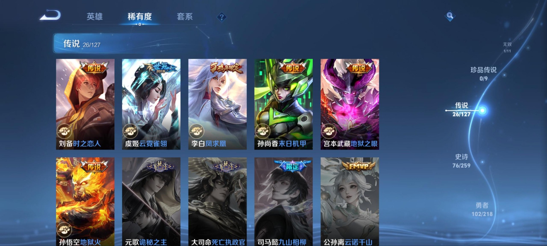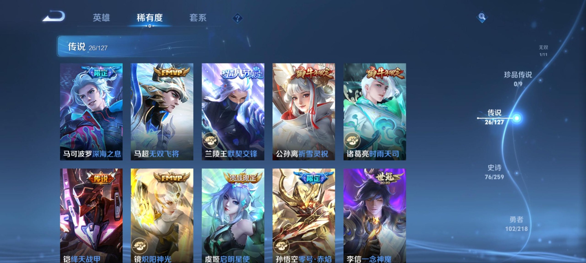 - [11687967]V8 1典藏 1珍品传说 26传说 125英雄 303皮肤 可修改实名 优质装备:鸣剑·曳影,怪盗基德,黄金狮子座,云鹰飞将(小将军),黄金白羊座,久胜战神,炽阳神光,一念神魔,零号·赤焰,超时空战士-狄仁杰,神器·狴犴令,画中仙,记忆之芯(机甲兔),鹤羽星尊,妄想实况,霜月吟,澜逐花归海,涂山容容 传说皮:貂蝉曦玄引,落雪白狼,云诺千山,祥瑞亨通,幻光神枪 珍宝阁皮:蔷薇恋人,玩趣恶龙 限定皮:愿照·九州拓(澜年限),愿照·山河定(司空震年限),逐霄战戟,陌上桑,鸣野蒿,至尊宝,飞衡(韩信年限),诗剑行,五谷丰年,游园惊梦,梁祝,逐梦之星,岱宗(典韦年限),李小龙,孙行者,大圣娶亲,引擎之心,云端筑梦师,启示之音,神器·万象笔 史诗皮:鸭鸭历险记-刘禅,器灵·浮梦炉,化蝶舞,星界战将,谪仙醉月,龙之律动,雪豹·霜爪,茶境仙,破空之剑,东方月初,海诺心动手记,琥珀纪元伽罗,蔬乡物语(鲁班七号),超元猎域,百相守梦-百里守约,百相守梦-黄忠,紫霞仙子,特工魅影,江河有灵,匿光侦查者,真我赫兹(百里守约),魅语,百解令(蒙犽),高渐离燃音魔法,蒙恬荣光圣徽,偶像歌手,白蛇,晚萤,电玩·爆裂旋风,暗夜猫娘,末日机甲-吕布,猫狗日记-孙策,猫狗日记-大乔,时之恋人-孙尚香,乱世虎臣,节奏热浪,摇滚巨星,水果甜心,星夜王子,心灵骇客,德古拉伯爵,暗隐猎兽者,幽灵船长,鬼剑武藏,暗渊魔法,乐园奇幻夜,天秀·启明,地狱岩魂,纤云弄巧,拒霜思,缤纷独角兽,乘风破浪,逐浪之夏,水晶猎龙者,曙光守护者,金属风暴,原初追逐者,圣诞狂欢,圣诞恋歌,鹰眼统帅,暗夜贵公子,赏金猎手,无心