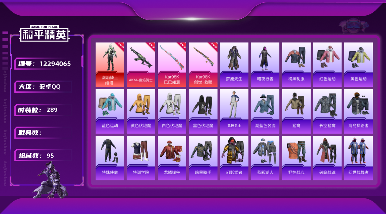 [12294065]1红装 3特效枪 2印记 可二次 可修改实名 优质装备:幽焰骑士-维塔 ,二级幽焰骑士-维塔(2级维塔),Kar98K创世·救赎,AKM-幽焰骑士,Kar98K-巳巳如意 热门装扮:暗夜行者,梦魇先生 三级特效枪:三级AKM-幽焰骑士,三级Kar98K-创世·救赎,三级Kar98K-巳巳如意 紫色装扮:岑岑玉浪,田园牧歌,轻风白浪,和煦暖阳,SS22特训,SS23特训,娇憨猪猪,萌趣咩咩,SS21特训,SS31特训套装,军械专家,冰川特警,SS30特训套装,SS20特训,飞驰魅影,音速流光,极速竞梦,SS19特训,野性战心,长空猛禽,缤纷果语,蓝彩潮人,蓝色运动,龙腾端午,麻辣教官,黄色伏地魔,黄色运动,黑色伏地魔,龟仙人,龙魂突击队,蝶变,香桃花海,柠萌假日,格斗先锋,橘黑制服,海岛探路者,暗黑骑手,幻影武者,夏日音浪,幻世战舞者,探宝勇士,湖蓝色名流,白色伏地魔,破晓战魂,破蛋小黄鸡,空岛之星,红色运动,牛气冲天,炫蓝之夏,牛气满满,猛禽,特殊使命,特训学院,SS29特训,星途旅人,纯真浪花,热情海星,鱼渊荷华,玉兔迎春,青团波波,糖糖葫芦,焰舞炽心,竞技名士,绒宝小鹅,摩登魅猫,街头风暴,粉红小猪,格斗专家,耀粉歌者,萌黄之夏,光之冒险 优质战备:星途旅人降落伞,幽焰列车飞行器,幽焰骑士降落伞,海螺星光降落伞,太空嘟嘟降落伞,飞行翼-星夜魔法师