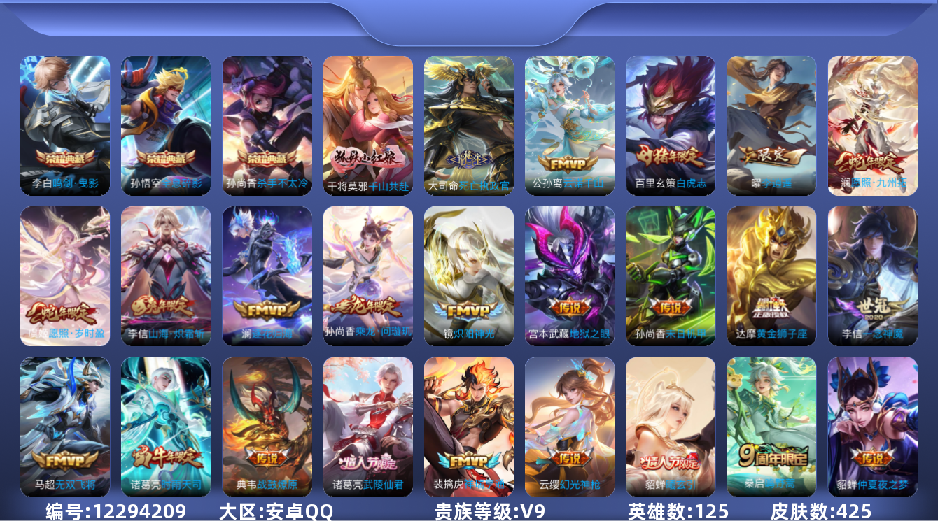 [12294209]V9 3典藏 44传说 125英雄 425皮肤 可修改实名 优质装备:杀手不太冷,鸣剑·曳影,全息碎影(猴子典藏),黄金狮子座,黄金射手座,冠军飞将,绛天战甲(鸡嘴战神),猫影幻舞,久胜战神,炽阳神光,一念神魔,云霓雀翎,末日机甲-孙尚香(绿蚂蚱),地狱火,仲夏夜之梦(大飞蛾),零号·赤焰,地狱之眼,胖达荣荣,李逍遥,时之恋人-刘备(电焊工),淬星耀世,超时空战士-狄仁杰,末日机甲-孙策,无双飞将,山海·炽霜斩(李信年限),炽翼辉光(娃娃菜牛角包),澜逐花归海,千山共赴,涂山容容 传说皮:乘龙·问璇玑(孙尚香年限),貂蝉曦玄引,典韦战鼓燎原,死亡执政官,云诺千山,祥瑞亨通,幻光神枪 珍宝阁皮:妄想食味,胡桃夹子,优雅恋人,蔷薇恋人 限定皮:愿照·九州拓(澜年限),愿照·岁时盈(虞姬年限),逐霄战戟,陌上桑,鸣野蒿,至尊宝,白虎志(电光耗子),武陵仙君(小桃花),傲雪梅枪,星穹之声,时雨天司(水龙头),神威(电光马子),飞衡(韩信年限),遇见飞天,高山流水,诗剑行,齐天大圣,匿光决锋者,怒海麟威,五谷丰年,冰锋战神,梁祝,天狼狩猎者,龙胆,烈魂,岱宗(典韦年限),天狼溯光者,李小龙,孙行者,猪悟能,引擎之心,匿光追影者,百木心枪,无尽星芒,山海·玄木吟(马可年限) 史诗皮:鸭鸭历险记-刘禅,器灵·浮梦炉,化蝶舞,灵蛊蚀心,谪仙醉月,龙之律动,雪豹·霜爪,藏狐·褐绒,破空之剑,东方月初,埋骨钱,琥珀纪元伽罗,百相守梦-百里守约,星界特工,紫霞仙子,苍穹之光,电玩小子(小书包),白龙吟,黄金分割率,特工魅影,千年之狐,永昼,江河有灵,浮梦罗烟,魅语,高渐离燃音魔法,无限星赏官,冰冠公主,偶像歌手,暗夜猫娘,龙骑士(小龙虾),末日机甲-吕布,猫狗日记-孙策,猫狗日记-大乔,时之恋人-孙尚香,乱世虎臣,节奏热浪,修罗,女仆咖啡,摇滚巨星,水果甜心,绅士熊喵,天才门将,星夜王子,心灵骇客,时之奇旅-安琪拉,功夫厨神,德古拉伯爵,暗隐猎兽者,幽灵船长,鬼剑武藏,暗渊魔法,心灵战警,乐园奇幻夜,天秀·启明,舞动绿茵,地狱岩魂,诗语江南,纤云弄巧,拒霜思,缤纷独角兽,乘风破浪,逐浪之夏,月团寄思,水晶猎龙者,曙光守护者,热力回旋,箭羽风息,金属风暴,原初追逐者,圣诞狂欢,圣诞恋歌,鹰眼统帅,暗夜贵公子,魅力维加斯,黎明之约,赏金猎手,无心,未来纪元-赵云