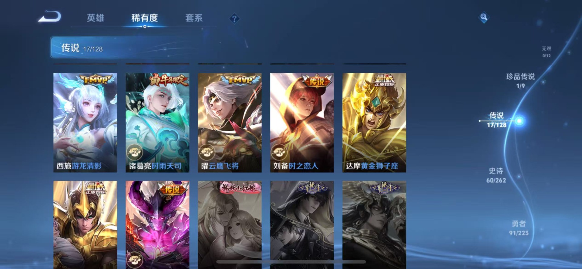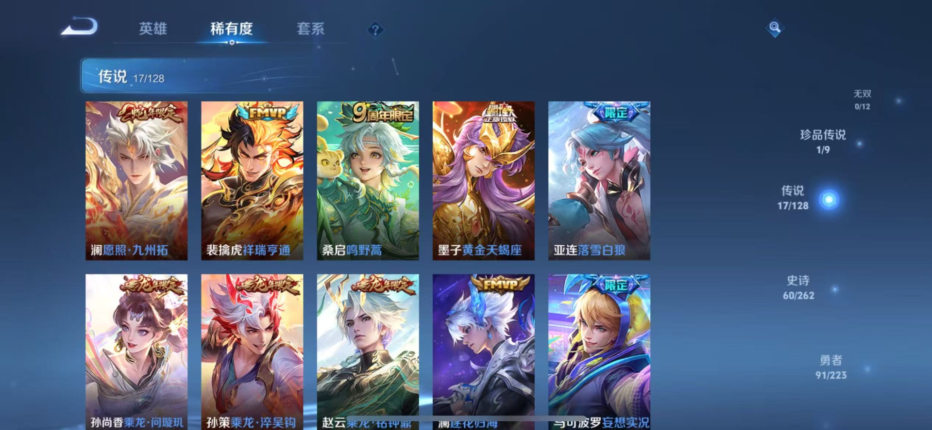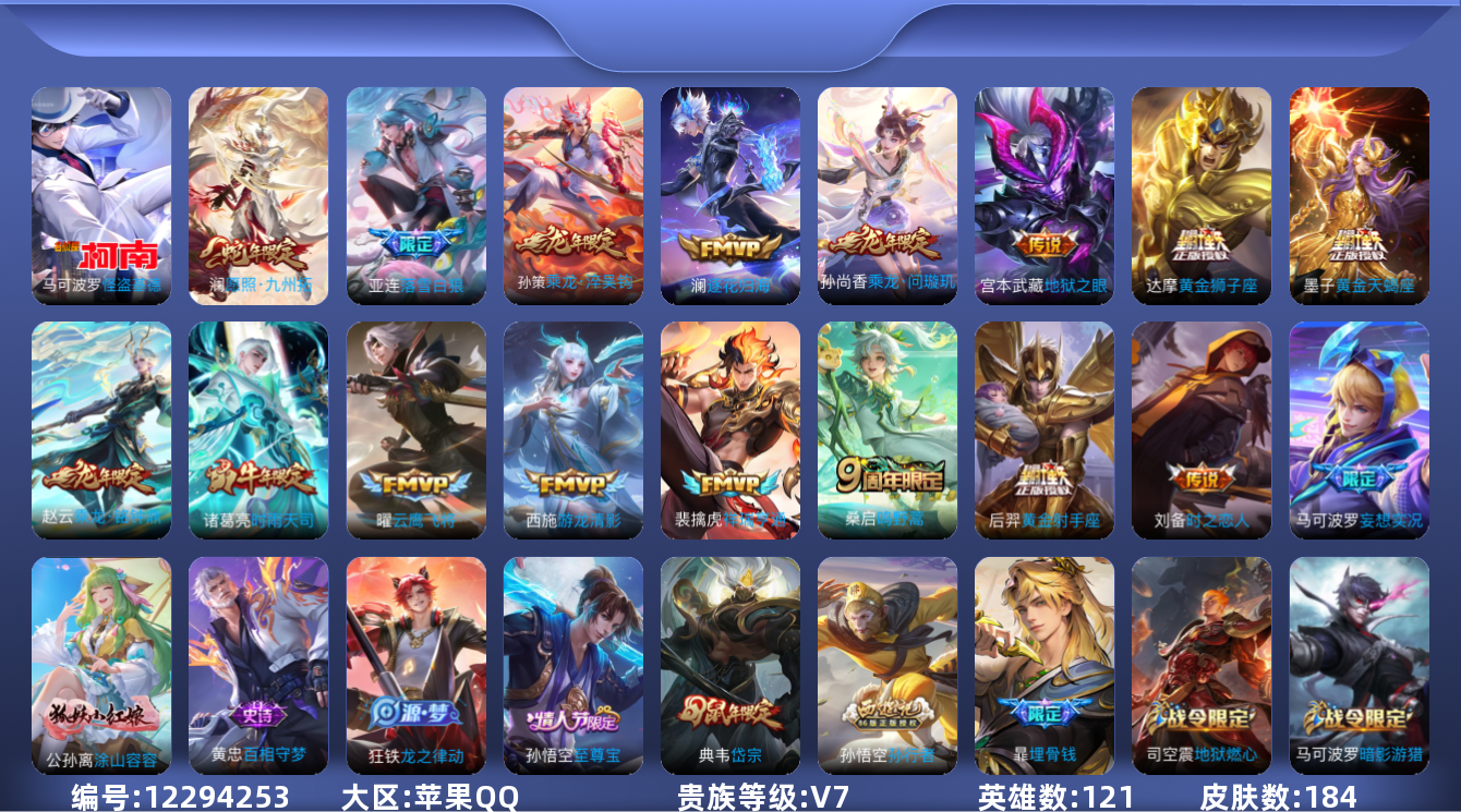 - [12024642]V7 2典藏 1无双 3珍品传说 8传说 124英雄 244皮肤 可修改实名 优质装备:鸣剑·曳影,星域神启(倪克斯贼亮),器灵·螭龙剑,怪盗基德,器灵·落星盏,黄金白羊座,炽阳神光 珍品传说:时之奇旅-孙策 传说皮:续相思,幻光神枪 珍宝阁皮:胡桃夹子,万物之道,蔷薇恋人 限定皮:愿照·九州拓(澜年限),愿照·山河定(司空震年限),逐霄战戟,鸣野蒿,傲雪梅枪,遇见飞天,高山流水,五谷丰年,祈雪灵祝(雪兔子),李小龙,山海·玄木吟(马可年限) 史诗皮:鸭鸭历险记-刘禅,器灵·浮梦炉,糖绘人间,瑰影绮梦,化蝶舞,星界战将,龙之律动,百相守梦-周瑜,茶境仙,破空之剑,东方月初,蒙犽顽岩魄,埋骨钱,曹操夜都魔契,百相守梦-百里守约,百相守梦-黄忠,织梦人,紫霞仙子,特工魅影,千年之狐,永昼,江河有灵,魅语,蒙恬荣光圣徽,无限星赏官,白蛇,电玩·爆裂旋风,猫狗日记-孙策,时之恋人-孙尚香,摇滚巨星,水果甜心,天才门将,星夜王子,心灵骇客,功夫厨神,鬼剑武藏,心灵战警,舞动绿茵,地狱岩魂,纤云弄巧,拒霜思,乘风破浪,逐浪之夏,曙光守护者,金属风暴,圣诞恋歌,鹰眼统帅,暗夜贵公子,魅力维加斯,赏金猎手,无心,未来纪元-赵云,玫瑰异探