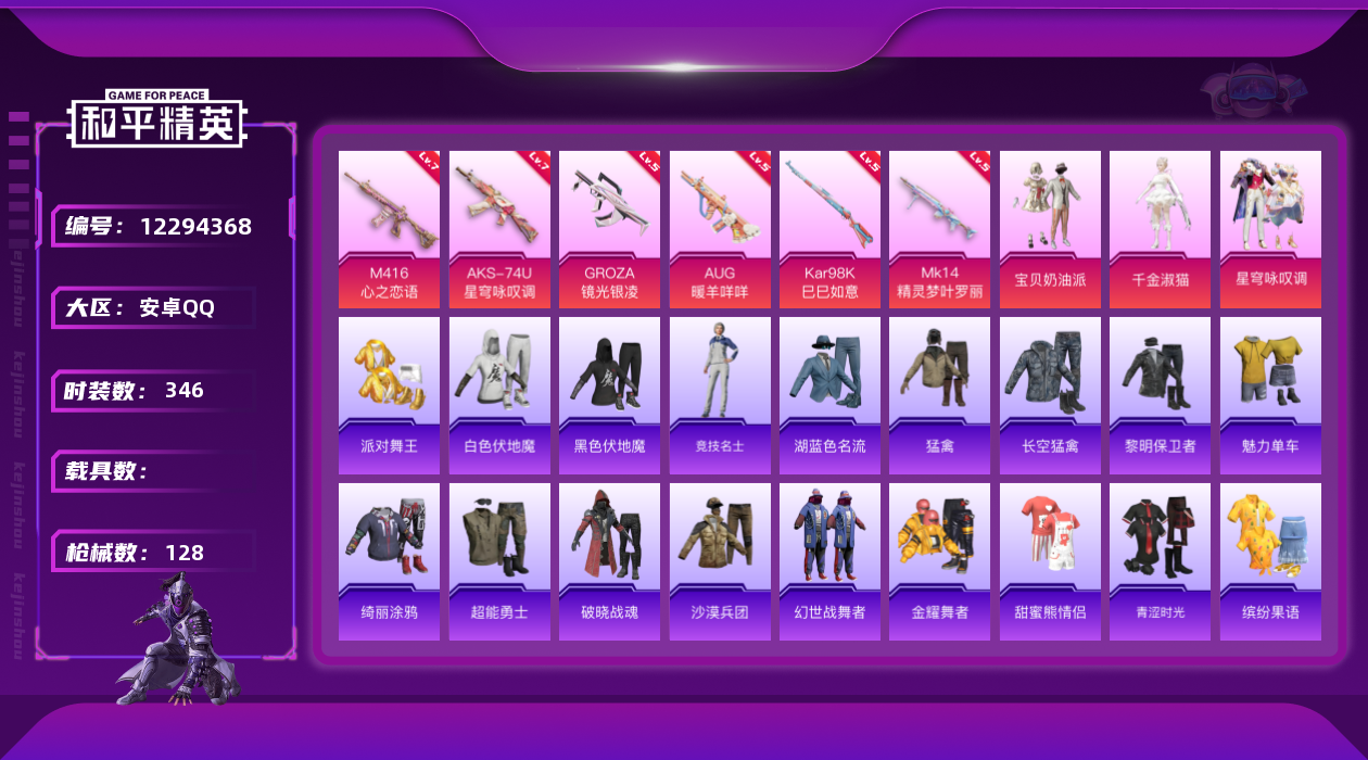- PX_2088271- 可二次 苹果手Q-5王牌印记-2粉装-5特效枪-0载具-24066热力值-54套装-78枪皮-2卓越印记-0传奇印记, 【2粉装】,智耀战神,女娲灵识, 【5特效枪】,M416-电玩时刻-5级,AUG-暖羊咩咩-5级,M762-鬼刀-6级,Kar98K-巳巳如意-5级,UMP45-量子极限-5级, 【3稀有紫装】,派对舞王,浪漫天命,龟仙人, 【54稀有时装】,蓝冰羽,恋语
