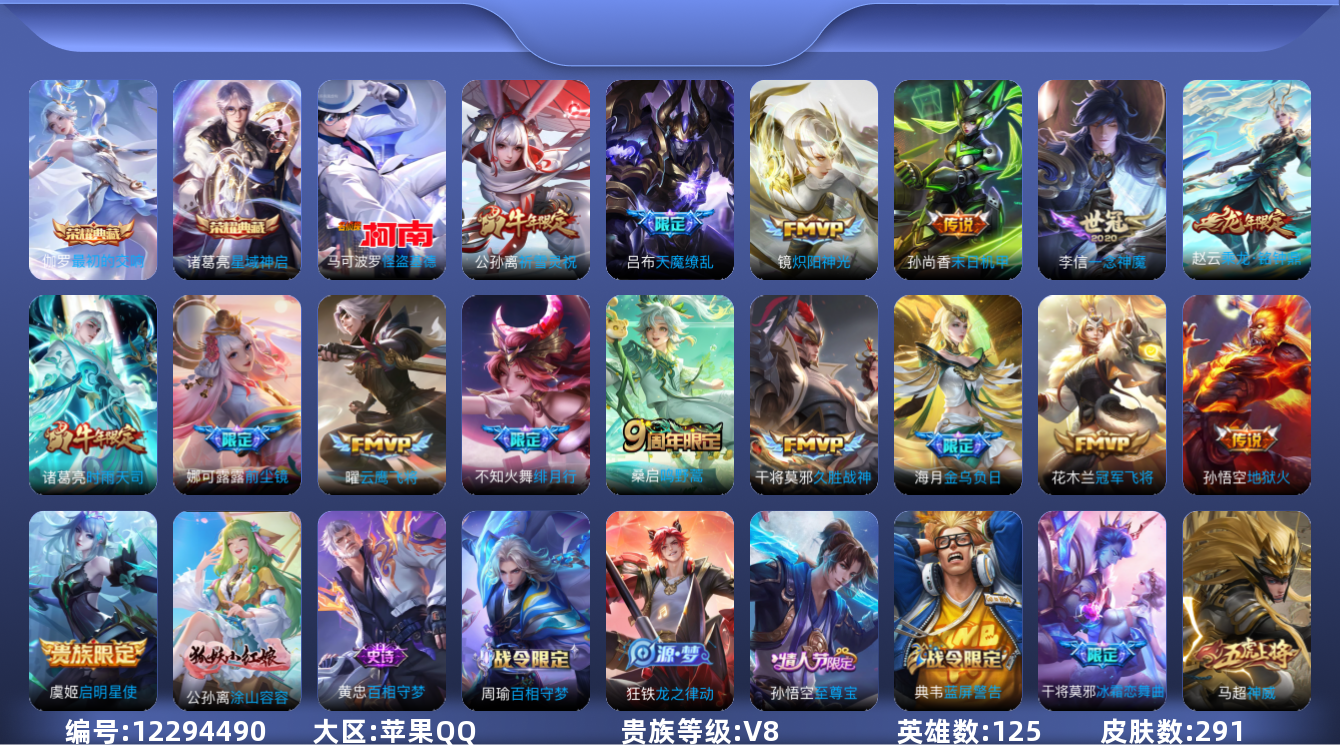 [12294490]V8 2典藏 1珍品传说 16传说 125英雄 291皮肤 可修改实名 优质装备:星域神启(倪克斯贼亮),最初的交响(伽罗典藏),怪盗基德,冠军飞将,云鹰飞将(小将军),久胜战神,炽阳神光,一念神魔,末日机甲-孙尚香(绿蚂蚱),地狱火,金乌负日,涂山容容 传说皮:乘龙·铭钟鼎(赵云年限) 珍宝阁皮:优雅恋人,女武神 限定皮:鸣野蒿,至尊宝,前尘镜,绯月行,时雨天司(水龙头),神威(电光马子),遇见飞天,五谷丰年,青龙志(铠年限),冰锋战神,游园惊梦,梁祝,天狼狩猎者,龙胆,逐梦之星,烈魂,虎魄,祈雪灵祝(雪兔子),天狼绘梦者,李小龙,逐梦之影,玄武志(苏烈年限),霸王别姬-项羽,猪悟能,天魔缭乱,青春决赛季,冰霜恋舞曲,蜜橘之夏,山海·玄木吟(马可年限) 史诗皮:龙之律动,百相守梦-周瑜,百相守梦-百里守约,百相守梦-黄忠,星界战将,紫霞仙子,电玩小子(小书包),黄金分割率,特工魅影,千年之狐,雪夜绮愿(周瑜),龙骑士(小龙虾),蒙恬荣光圣徽,魅语,冰冠公主,偶像歌手,浮梦罗烟,匿光破解者,暗夜猫娘,末日机甲-吕布,猫狗日记-孙策,乱世虎臣,节奏热浪,女仆咖啡,摇滚巨星,水果甜心,绅士熊喵,天才门将,星夜王子,心灵骇客,功夫厨神,德古拉伯爵,暗隐猎兽者,幽灵船长,鬼剑武藏,舞动绿茵,地狱岩魂,纤云弄巧,繁星吟游(呼啦呼啦),拒霜思,缤纷独角兽,乘风破浪,逐浪之夏,月团寄思,水晶猎龙者,曙光守护者,箭羽风息,金属风暴,原初追逐者,圣诞狂欢,圣诞恋歌,鹰眼统帅,暗夜贵公子,魅力维加斯,黎明之约,无心