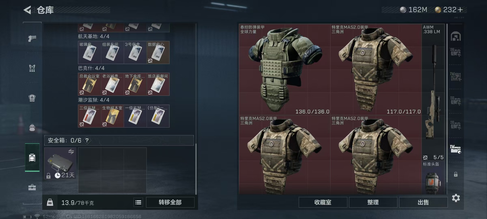 [12294529]总资产:382.4M 1干员外观 1传说枪械 哈夫币:162K 高级安全箱(2×3)9.15号到期 可二次 可修改实名 烽火地带段位:钻石 全面战场段位:尉官 传说武器皮肤:M4A1突击步枪-阿米娅 史诗武器皮肤:M4A1突击步枪-竞技风 干员外观:蜂医-送葬人·无题密令(S5)