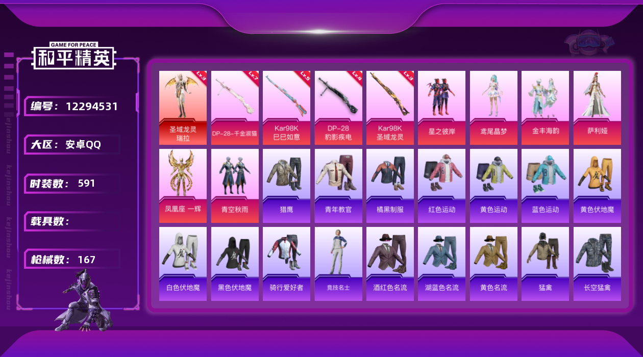 [12294531]1红装 6粉装 4特效枪 16印记 可二次 可修改实名 优质装备:圣域龙灵-瑞拉,三级圣域龙灵-瑞拉(3级瑞拉),僚机-圣域龙宝,星之彼岸,DP-28-千金淑猫,七级DP-28-千金淑猫,萨利娅,Kar98K-圣域龙灵,凤凰座 一辉,Kar98K-巳巳如意 热门装扮:青空秋雨,鸢尾晶梦,金丰海韵 五级特效枪:五级Kar98K-巳巳如意 四级特效枪:四级DP-28-豹影疾电 三级特效枪:三级Kar98K-圣域龙灵 紫色装扮:田园牧歌,轻风白浪,SS22特训,和煦暖阳,飞狐塔尔斯,妙红点点,灵蜜圈圈,幻彩翩翩,SS23特训,俏皮奶喵,娇憨猪猪,萌趣咩咩,暖心熊熊,SS21特训,SS30特训套装,人气偶像,冷焰舞者,北国孤狼,SS20特训,SS31特训套装,雪绒豹,SS33特训套装,灵公主,快乐星愿,SS16特训,星梦畅游,SS13特训,SS14特训,SS19特训,电音精灵,SS17特训,SS18特训,坚韧舞者,长空猛禽,都市魅力,酒红色名流,野性战心,霓虹街区,青年教官,耀眼新星,荣耀,蓝彩潮人,蓝色守护者,蓝色运动,虎虎生威吉莉,街头潮人,跃动心情,龙的传人,飞行日记,骑行爱好者,魅力单车,鹤鸣,麻辣教官,黄色伏地魔,黄色名流,黄色运动,黎明保卫者,黑色伏地魔,龟仙人,冰河战士,龙魂突击队,蝶变,香桃花海,绮丽涂鸦,极速红龙,柠萌假日,格斗先锋,橘黑制服,沙漠兵团,活力之心,海岛探路者,涂山之恋,深蓝色名流,湖蓝色名流,幻世战舞者,完美偶像,帅气教官,幻影武者,怒火燎原,战地督导,探宝勇士,滨海假日,甜蜜熊情侣,白色伏地魔,破晓战魂,破蛋小黄鸡,王牌教练,福星高照,空岛之星,空投萌叽,竞技勇士朋克,竞技达人朋克,红色运动,甜蜜告白,猛禽,滨海厨神,灰色格斗者,灼焰舞者,炫蓝之夏,热血青春,牛气冲天,猎鹰,牛气满满,湖畔霞光,小熊娃娃,雏菊兔兔,萝兰蝴蝶,SS29特训,银尘,纯真浪花,热情海星,曼妙人鱼,SS28特训,迎夏光舞,星途旅人,巳巳如意,石蕴玉辉,鱼渊荷华,玉兔迎春,燕燕于飞,森林游猎者,青团波波,糖糖葫芦,棉花软糖,竞技名士,都市丽猫,摩登魅猫,街头风暴,智谋强哥,惊鸿侠骨,SS25特训,甜梦熊熊,神气柴柴,懵萌河马,SS24特训(SS24特训套装),锦衣飞扬,绝对偶像,金戈铁马,SS27特训,粉红小猪,SS26特训,新侠客行,SS12特训,耀粉歌者