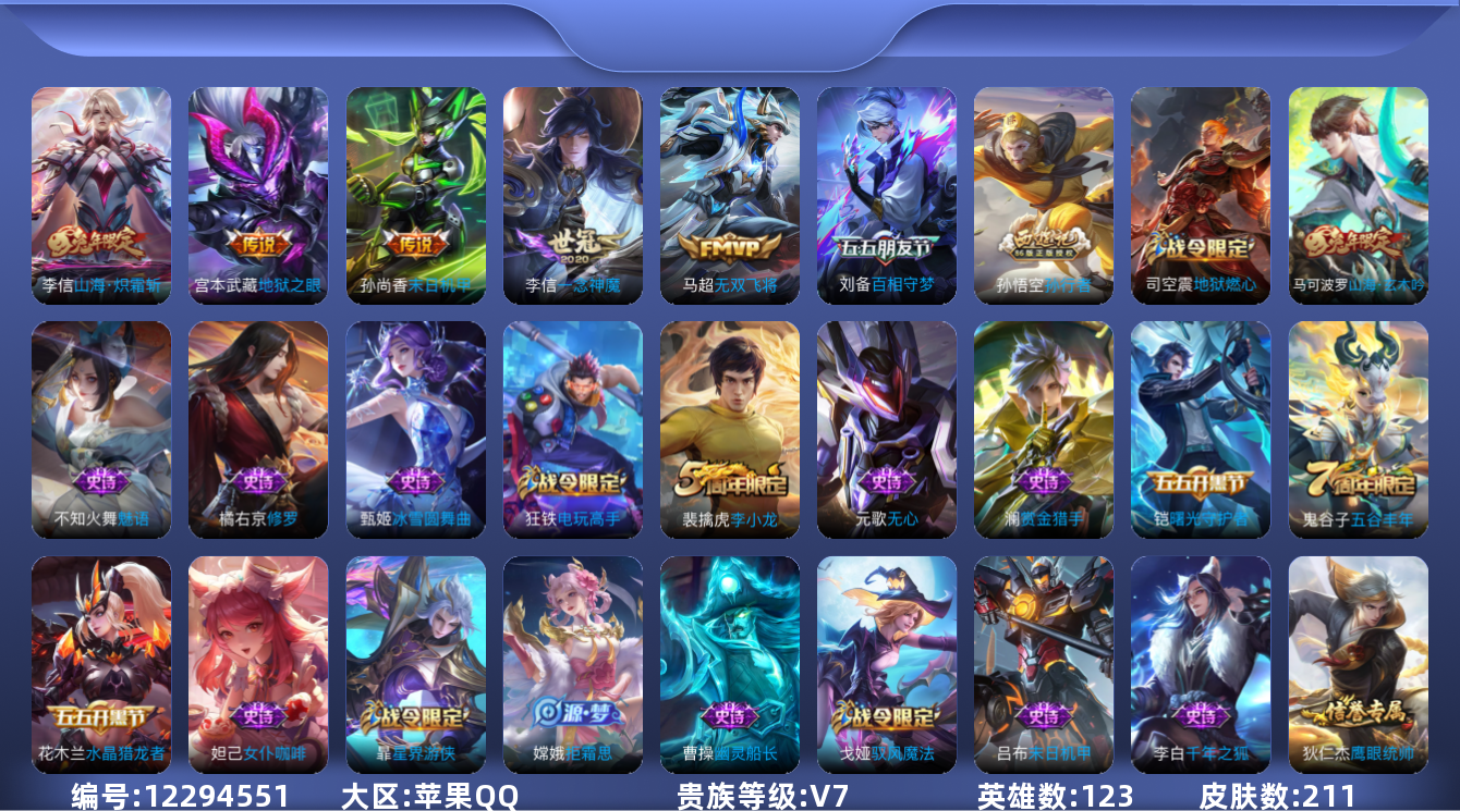[12294551]V7 5传说 123英雄 211皮肤 可修改实名 优质装备:一念神魔,末日机甲-孙尚香(绿蚂蚱),地狱之眼,无双飞将,山海·炽霜斩(李信年限) 珍宝阁皮:优雅恋人,女武神 限定皮:五谷丰年,李小龙,孙行者,山海·玄木吟(马可年限) 史诗皮:星界战将,千年之狐,江河有灵,魅语,百解令(蒙犽),蒙恬荣光圣徽,百相守梦(刘备),末日机甲-吕布,猫狗日记-孙策,乱世虎臣,节奏热浪,修罗,女仆咖啡,水果甜心,绅士熊喵,天才门将,星夜王子,德古拉伯爵,暗隐猎兽者,幽灵船长,鬼剑武藏,心灵战警,拒霜思,逐浪之夏,水晶猎龙者,曙光守护者,金属风暴,原初追逐者,圣诞狂欢,圣诞恋歌,鹰眼统帅,魅力维加斯,黎明之约,赏金猎手,无心,未来纪元-赵云