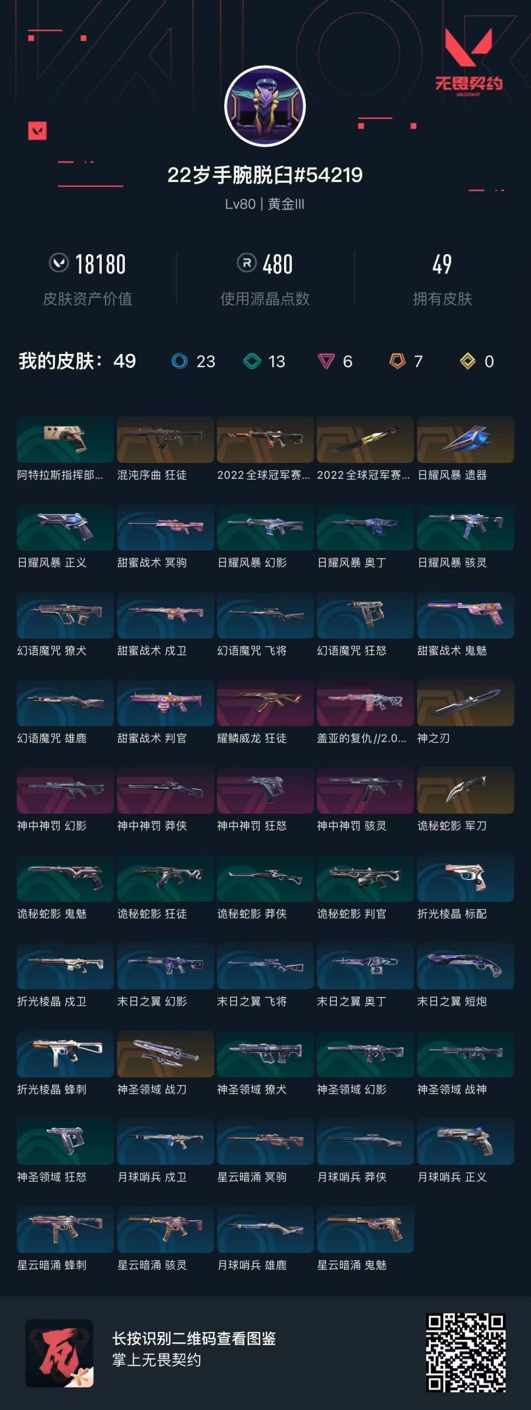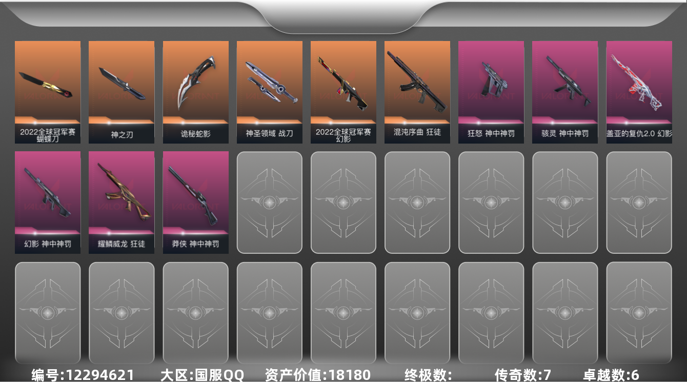 [12294621]7橙皮 6紫皮 49皮肤 25英雄 60卡面 480已用源晶 黄金 优质装备:狂徒-混沌序曲,幻影-盖亚的复仇2.0,狂徒-耀鳞威龙,神圣领域 战刀,诡秘蛇影,神之刃 亮点皮肤:幻影-2022全球冠军赛,2022全球冠军赛 蝴蝶刀 套装:神罚套装,2022全球冠军赛,神中神罚套装 佩枪皮肤:狂怒-神中神罚 冲锋枪皮肤:骇灵-神中神罚 步枪皮肤:幻影-神中神罚 狙击枪皮肤:莽侠-神中神罚