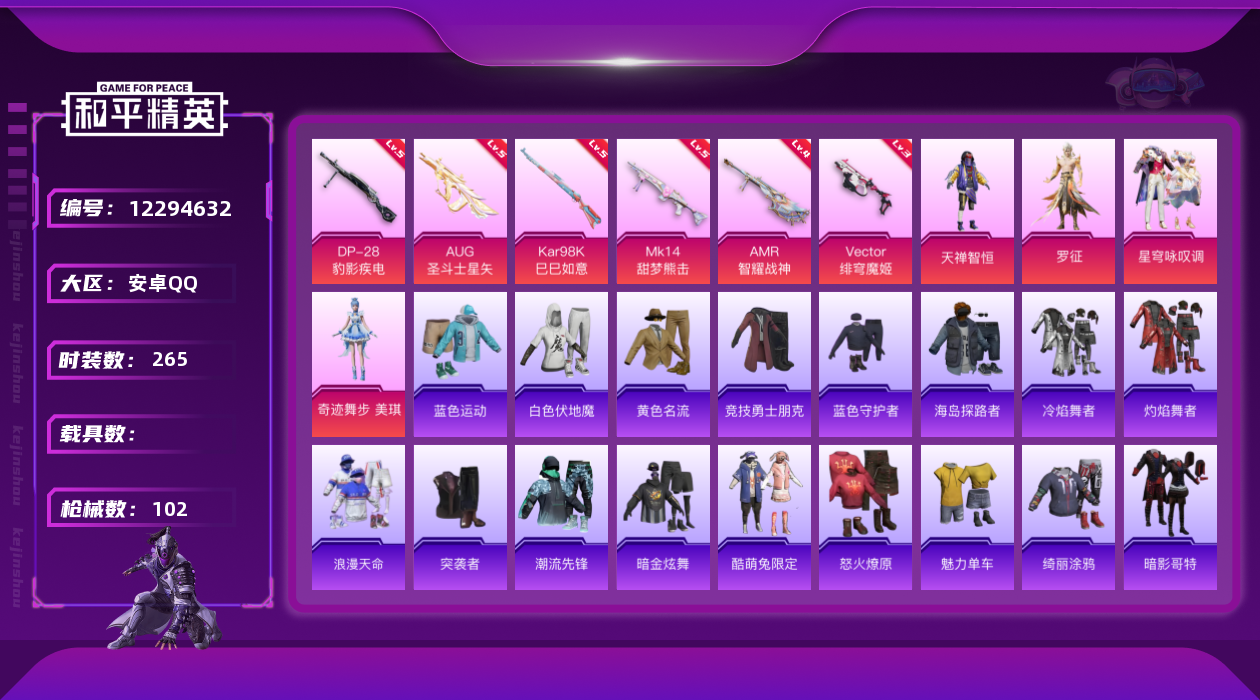 - PX_2091728- 安卓手Q-8王牌印记-5粉装-7特效枪-2载具-95625热力值-202套装-295枪皮-0卓越印记-0传奇印记 【5粉装】,初号机 觉醒Ver.,绯穹魔姬,千金淑猫,深渊皇后,烟云彩露 【7特效枪】AKM-绿萝繁花-5级 M416-风花雪月-7级 Kar98K-圣域龙灵-3级 Kar98K-巳巳如意-5级 Mk14-精灵梦叶罗丽-5级 UMP45-量子极限-5级 MG3-