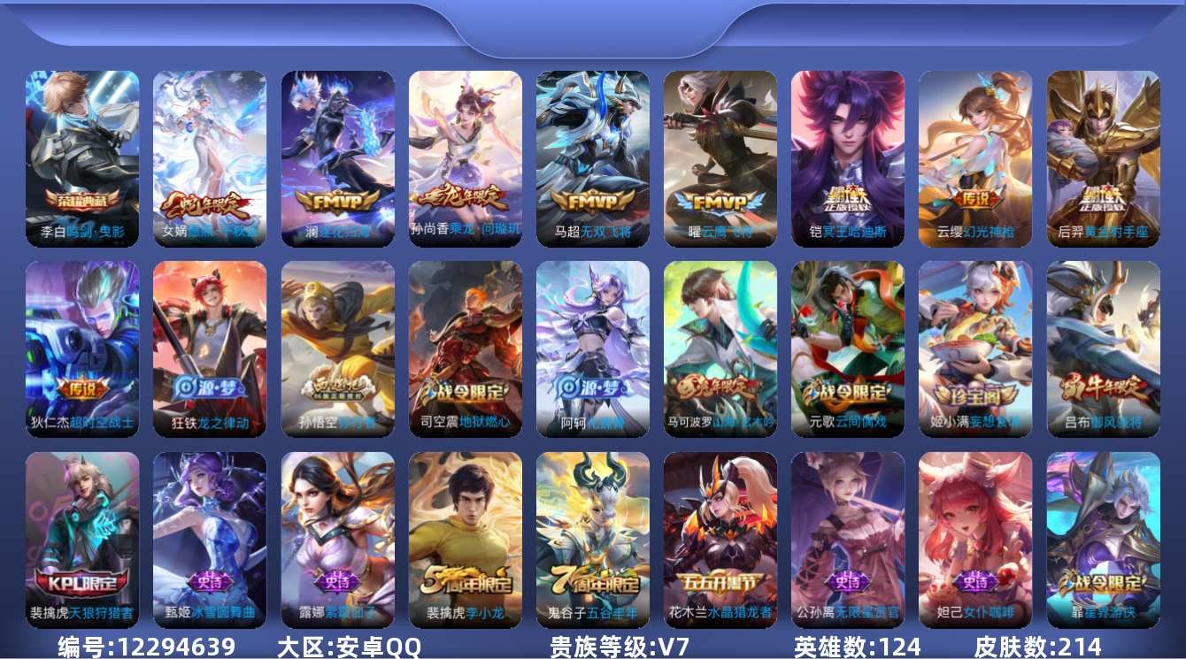 - [11824317]V7 1典藏 7传说 124英雄 316皮肤 可修改实名 荣耀水晶:鸣剑·曳影 传说皮:幻光神枪,地狱火,末日机甲-孙尚香(绿蚂蚱),云霓雀翎,久胜战神 珍宝阁皮:妄想食味,优雅恋人,玩趣恶龙 限定皮:逐霄战戟,鸣野蒿,至尊宝,武陵仙君(小桃花),魔法小厨娘,飞衡(韩信年限),高山流水,五谷丰年,梁祝,李小龙,大圣娶亲 史诗皮:星界战将,灵蛊蚀心,龙之律动,蔬乡物语(鲁班七号),化蝶舞,紫霞仙子,苍穹之光,电玩小子(小书包),白龙吟,黄金分割率,特工魅影,千年之狐,江河有灵,高渐离燃音魔法,雪夜绮愿(周瑜),百解令(蒙犽),蒙恬荣光圣徽,冰冠公主,偶像歌手,无限星赏官,电玩·爆裂旋风,暗夜猫娘,龙骑士(小龙虾),末日机甲-吕布,猫狗日记-孙策,猫狗日记-大乔,乱世虎臣,节奏热浪,女仆咖啡,摇滚巨星,水果甜心,绅士熊喵,天才门将,星夜王子,心灵骇客,功夫厨神,德古拉伯爵,暗隐猎兽者,幽灵船长,鬼剑武藏,心灵战警,舞动绿茵,地狱岩魂,诗语江南,纤云弄巧,繁星吟游(呼啦呼啦),拒霜思,缤纷独角兽,乘风破浪,逐浪之夏,月团寄思,水晶猎龙者,曙光守护者,箭羽风息,唤灵魅影,金属风暴,原初追逐者,圣诞狂欢,圣诞恋歌,鹰眼统帅,王者之锤,暗夜贵公子,魅力维加斯,黎明之约,无心,未来纪元-赵云