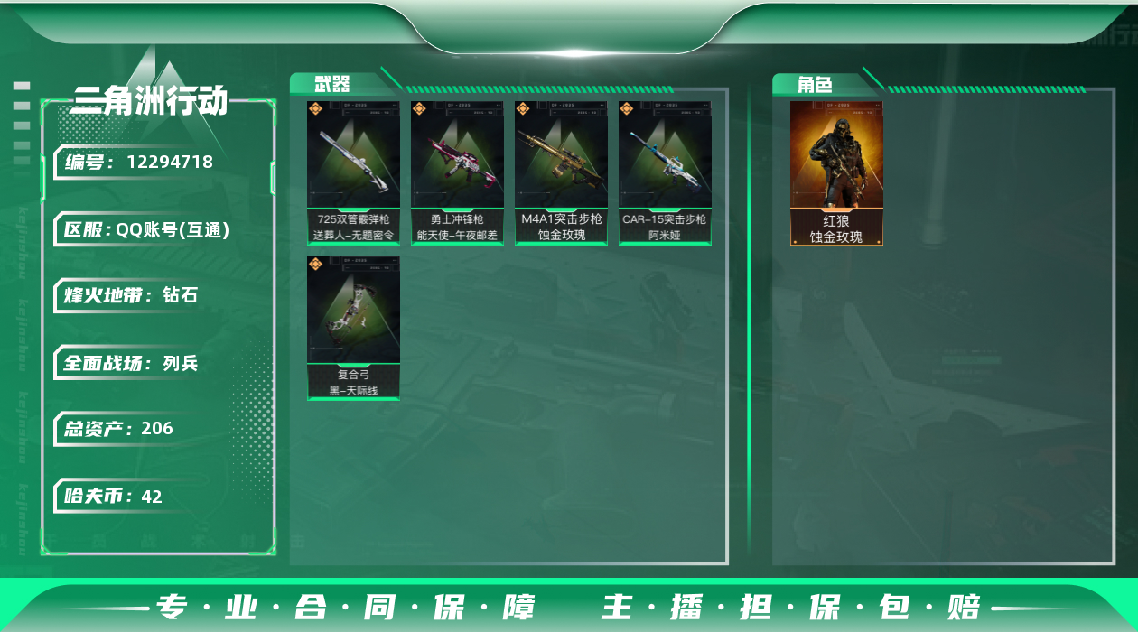 [12294718]总资产:206.3M 1干员外观 5传说枪械 哈夫币:42.527K 顶级安全箱(3×3)9.15号到期 可二次 可修改实名 优质装备:顶级安全箱(3x3) 烽火地带段位:钻石 全面战场段位:列兵 传说武器皮肤:CAR-15突击步枪-阿米娅,复合弓-黑-天际线,勇士冲锋枪-能天使-午夜邮差,725双管霰弹枪-送葬人-无题密令,M4A1突击步枪-蚀金玫瑰 干员外观:红狼-蚀金玫瑰