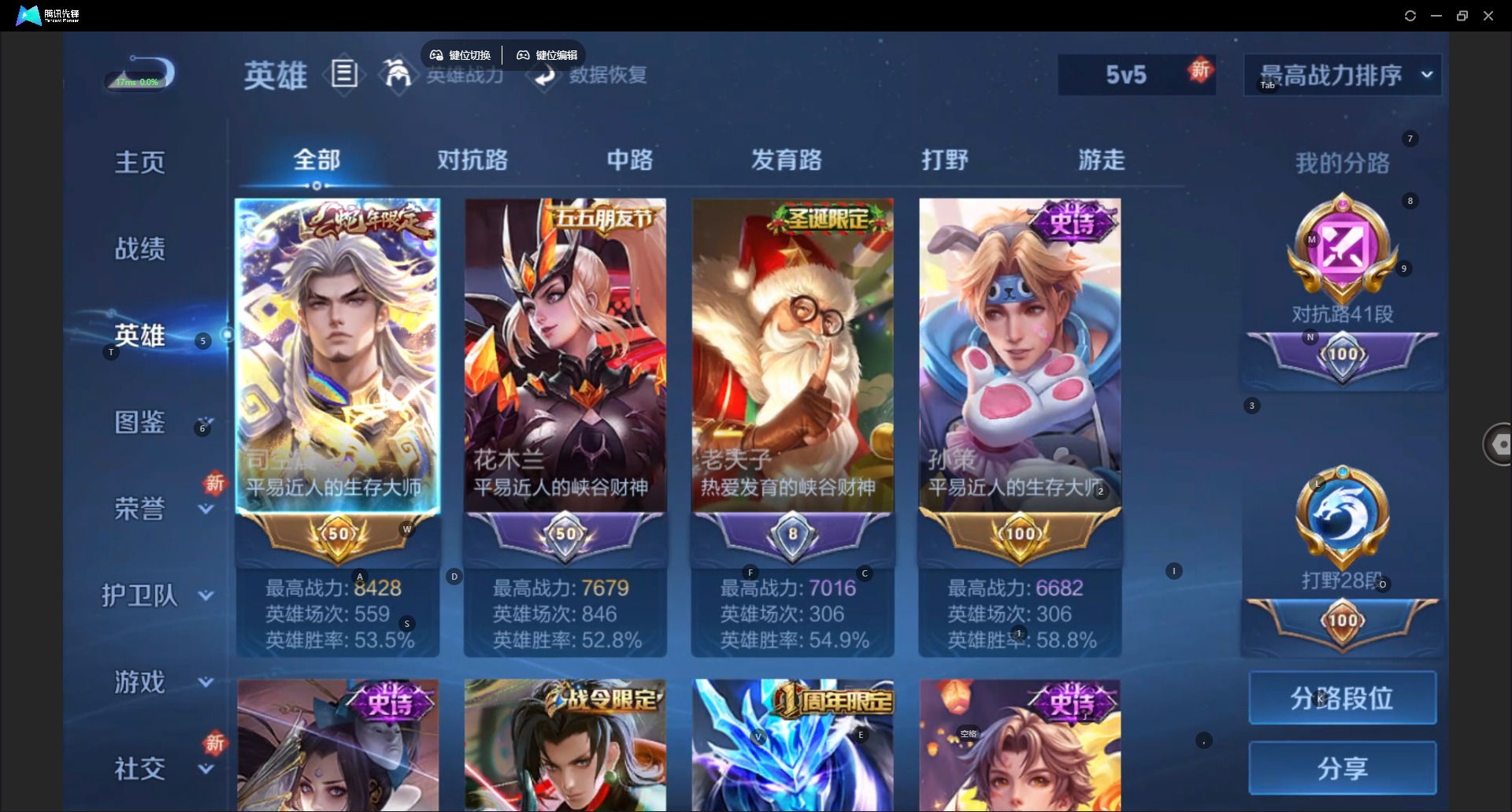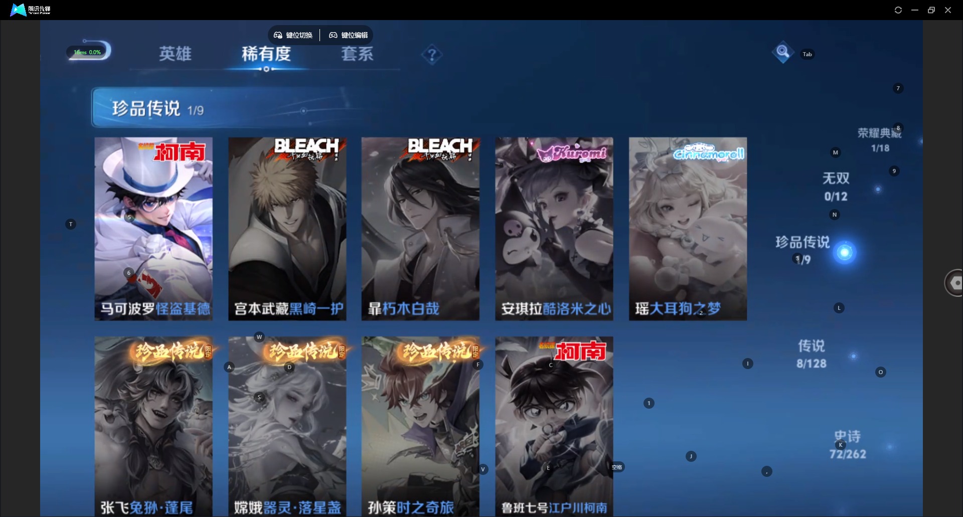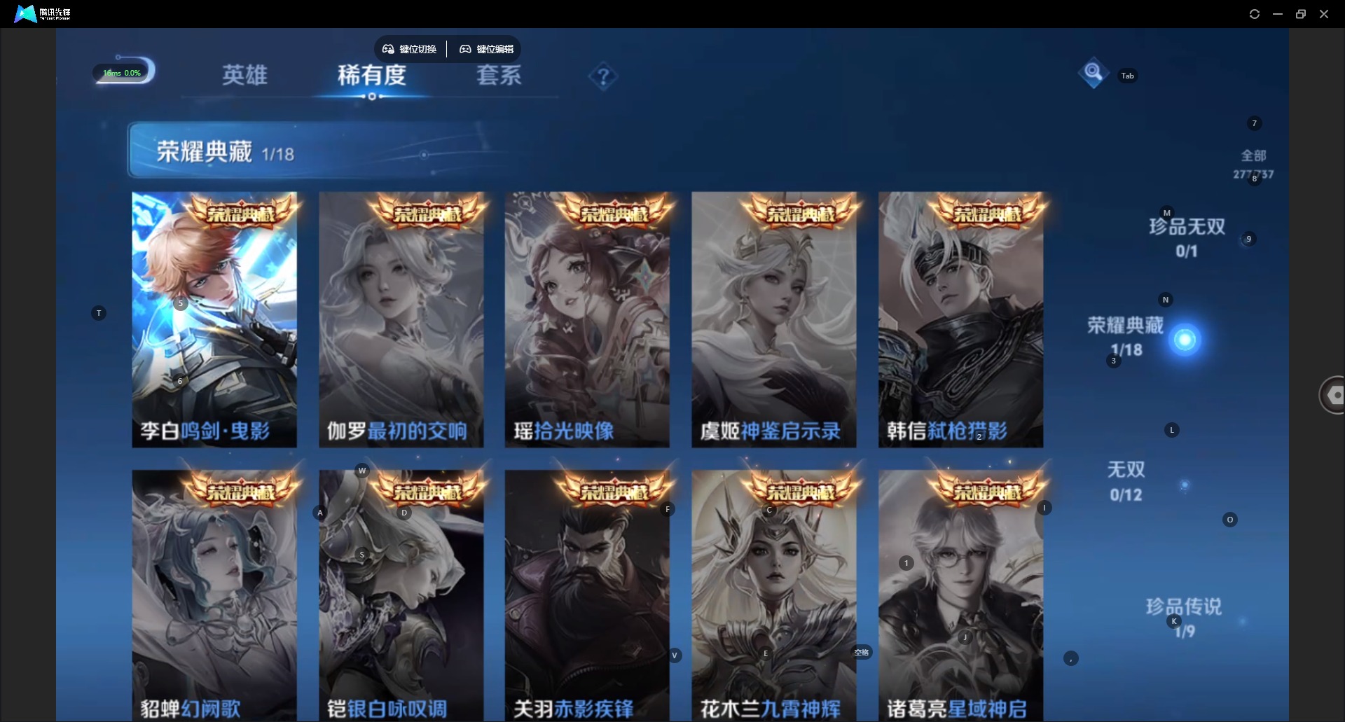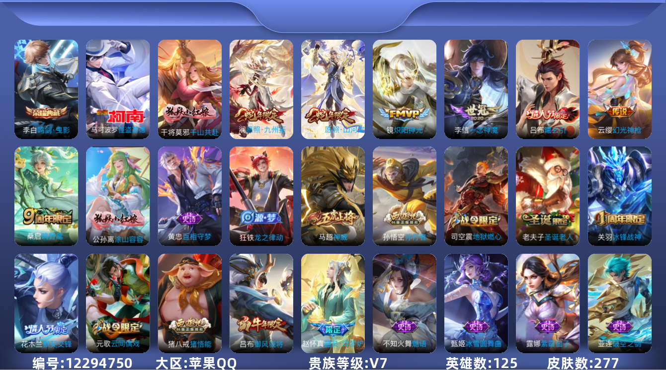 [12294750]V7 1典藏 1珍品传说 8传说 125英雄 277皮肤 可修改实名 优质装备:鸣剑·曳影,怪盗基德,炽阳神光,一念神魔,千山共赴,涂山容容 传说皮:吕布曦玄引,幻光神枪 珍宝阁皮:万物之道,蔷薇恋人,玩趣恶龙 限定皮:愿照·九州拓(澜年限),愿照·山河定(司空震年限),逐霄战戟,鸣野蒿,神威(电光马子),高山流水,五谷丰年,冰锋战神,御风骁将(吕布年限),李小龙,圣诞老人,默契交锋-花木兰,孙行者,猪悟能 史诗皮:器灵·浮梦炉,糖绘人间,龙之律动,茶境仙,蒙犽顽岩魄,破空之剑,百相守梦-黄忠,星界战将,紫霞仙子,黄金分割率,特工魅影,千年之狐,永昼,江河有灵,高渐离燃音魔法,蒙恬荣光圣徽,魅语,偶像歌手,电玩·爆裂旋风,末日机甲-吕布,猫狗日记-孙策,乱世虎臣,节奏热浪,摇滚巨星,水果甜心,绅士熊喵,天才门将,星夜王子,时之奇旅-安琪拉,功夫厨神,德古拉伯爵,暗隐猎兽者,幽灵船长,鬼剑武藏,地狱岩魂,缤纷独角兽,乘风破浪,逐浪之夏,月团寄思,水晶猎龙者,曙光守护者,箭羽风息,金属风暴,原初追逐者,圣诞狂欢,鹰眼统帅,魅力维加斯,黎明之约,未来纪元-赵云