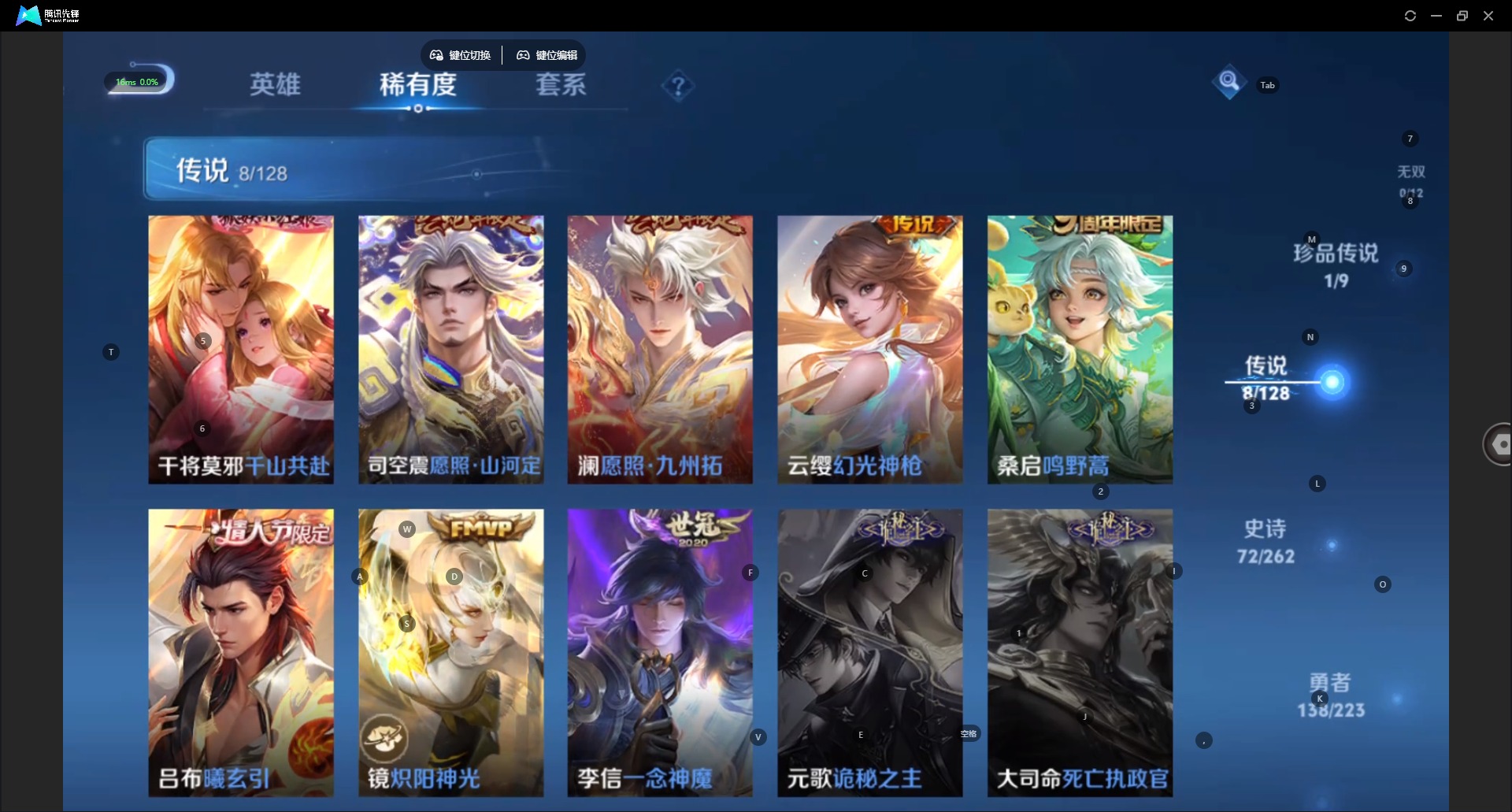 - [11936505]V10 3典藏 2无双 2珍品传说 64传说 125英雄 476皮肤 可修改实名 优质装备:鸣剑·曳影,幻阙歌(貂蝉典藏),碎月剑心(李白无双),韩信群星魔术团(韩信无双),拾光映像(瑶典藏),怪盗基德,黄金狮子座,黄金射手座,冠军飞将,云鹰飞将(小将军),绛天战甲(鸡嘴战神),猫影幻舞,久胜战神,炽阳神光,一念神魔,云霓雀翎,末日机甲-孙尚香(绿蚂蚱),地狱火,仲夏夜之梦(大飞蛾),零号·赤焰,地狱之眼,胖达荣荣,时之恋人-刘备(电焊工),游龙清影(小青龙),淬星耀世,超时空战士-狄仁杰,遇见胡旋,末日机甲-孙策,无双飞将,音你闪耀(rap皮),碎云,山海·炽霜斩(李信年限),山海·琳琅生(小乔年限),山海·苍雷引(电光曜子),燃星之曲,浮生妄,记忆之芯(机甲兔),电玩·雷克斯,霜月吟,澜逐花归海,艾琳觅芳踪,朵莉亚心动手记,涂山容容 珍品传说:兔狲·蓬尾 传说皮:乘龙·问璇玑(孙尚香年限),乘龙·铭钟鼎(赵云年限),乘龙·淬吴钩(孙策年限),云诺千山,幻光神枪 珍宝阁皮:妄想食味,蔷薇恋人,女武神 限定皮:愿照·九州拓(澜年限),愿照·福禄聚(蔡文姬年限),愿照·岁时盈(虞姬年限),愿照·山河定(司空震年限),愿照·众生和(妲己年限),愿照·千秋盛(女娲年限),鸣野蒿,至尊宝,凤求凰(白切鸡),武陵仙君(小桃花),异界灵契(白毛香),傲雪梅枪,寅虎·展翼(孙膑年限),星穹之声,绯月行,白晶晶,时雨天司(水龙头),神威(电光马子),飞衡(韩信年限),山海·碧波行(瑶年限),无限倾心-项羽,遇见飞天,高山流水,诗剑行,无限倾心-虞姬,齐天大圣,怒海麟威,五谷丰年,青龙志(铠年限),冰锋战神,天狼运算者,游园惊梦,梁祝,御风骁将(吕布年限),天狼狩猎者,天狼溯光者,祈雪灵祝(雪兔子),天狼绘梦者,李小龙,逐梦之影,如梦令-嫦娥,如梦令-后羿,圣诞老人,孙行者,一生所爱,大圣娶亲,青春决赛季,乒乒小将,蜜橘之夏,神奇女侠,匿光追影者,寅虎·御盾(廉颇年限),寅虎·瑞焰(虎皮蛋子),寅虎·心曲(虎婆),寅虎·赤拳(老虎年限),时之祈愿-瑶(瑶传限),玉兔公主,山海·玄木吟(马可年限) 史诗皮:器灵·浮梦炉,化蝶舞,灵蛊蚀心,星界战将,谪仙醉月,龙之律动,石田雨龙,茶境仙,破空之剑,海诺心动手记,琥珀纪元伽罗,蔬乡物语(鲁班七号),超元猎域,乘龙·聚宝船(安琪拉年限),