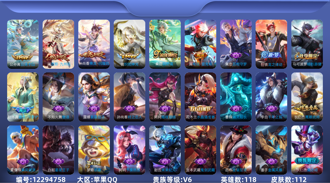 [12294758]V6 6传说 118英雄 112皮肤 可修改实名 优质装备:炽阳神光,电玩·雷克斯 传说皮:乘龙·问璇玑(孙尚香年限),云诺千山 珍宝阁皮:玩趣恶龙 限定皮:愿照·九州拓(澜年限),逐霄战戟,鸣野蒿 史诗皮:器灵·浮梦炉,龙之律动,茶境仙,百相守梦-黄忠,紫霞仙子,千年之狐,魅语,暗夜猫娘,时之恋人-孙尚香,节奏热浪,星夜王子,幽灵船长,鬼剑武藏,乘风破浪,逐浪之夏,水晶猎龙者,金属风暴,圣诞狂欢,鹰眼统帅,暗夜贵公子,魅力维加斯,未来纪元-赵云