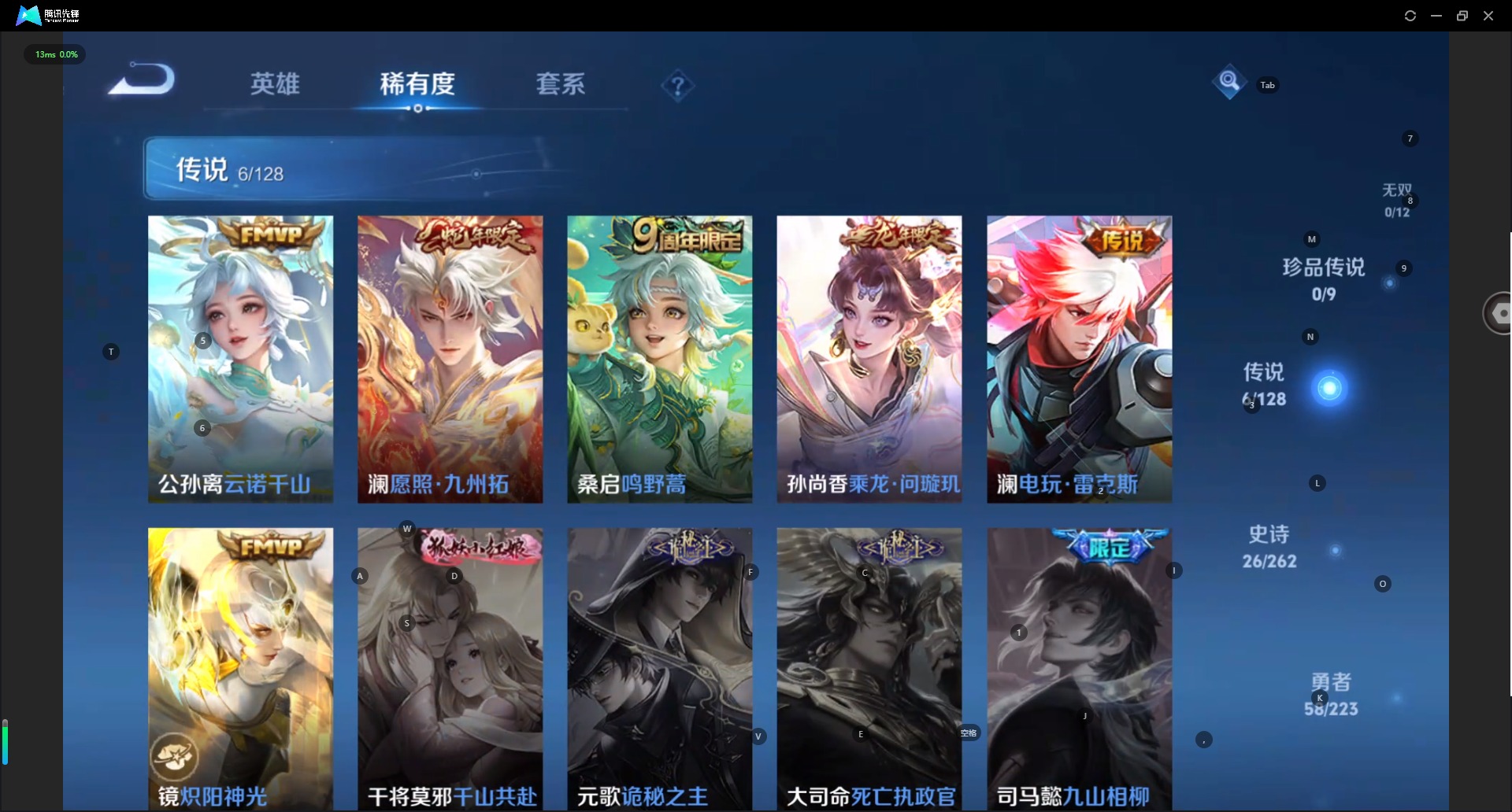 - [12296120]V9 2典藏 1珍品传说 28传说 126英雄 380皮肤 可修改实名 优质装备:九霄神辉(木兰典藏),银白咏叹调(倪克斯侍卫),黄金狮子座,黄金射手座,云鹰飞将(小将军),绛天战甲(鸡嘴战神),久胜战神,炽阳神光,一念神魔,末日机甲-孙尚香(绿蚂蚱),地狱之眼,乞巧织情,时之恋人-刘备(电焊工),游龙清影(小青龙),超时空战士-狄仁杰,碎云,澜逐花归海,琥珀纪元铠,涂山容容 珍品传说:时之奇旅-孙策 传说皮:乘龙·铭钟鼎(赵云年限),典韦战鼓燎原,铠冥王哈迪斯,幻光神枪,祥瑞亨通 珍宝阁皮:胡桃夹子,蔷薇恋人 限定皮:愿照·九州拓(澜年限),愿照·山河定(司空震年限),逐霄战戟,鸣野蒿,夏侯惇霜北刀,至尊宝,凤凰于飞,神威(电光马子),飞衡(韩信年限),高山流水,诗剑行,降魔,五谷丰年,冰锋战神,游园惊梦,梁祝,岱宗(典韦年限),虎魄,天狼征服者,李小龙,孙行者,猪悟能,大圣娶亲,天魔缭乱,冰霜恋舞曲 史诗皮:苍鳞隐世,器灵·浮梦炉,绮世丹青,化蝶舞,鸭鸭历险记-刘禅,雪豹·霜爪,龙之律动,琥珀纪元伽罗,藏狐·褐绒,茶境仙,百相守梦-百里守约,谪仙醉月,星界特工,破空之剑,埋骨钱,芈月浮光幕影,怒海争锋,决胜骁骑,蔬乡物语(鲁班七号),百相守梦-黄忠,星界战将,紫霞仙子,苍穹之光,电玩小子(小书包),黄金分割率,特工魅影,千年之狐,永昼,白蛇,江河有灵,百解令(蒙犽),高渐离燃音魔法,蒙恬荣光圣徽,魅语,冰冠公主,青蛇,偶像歌手,末日机甲-吕布,猫狗日记-孙策,猫狗日记-大乔,时之恋人-孙尚香,乱世虎臣,节奏热浪,修罗,女仆咖啡,摇滚巨星,水果甜心,绅士熊喵,天才门将,星夜王子,心灵骇客,功夫厨神,德古拉伯爵,暗隐猎兽者,幽灵船长,鬼剑武藏,心灵战警,天秀·启明,舞动绿茵,地狱岩魂,诗语江南,纤云弄巧,缤纷独角兽,乘风破浪,逐浪之夏,水晶猎龙者,曙光守护者,箭羽风息,金属风暴,圣诞狂欢,圣诞恋歌,鹰眼统帅,暗夜贵公子,魅力维加斯,黎明之约,赏金猎手,未来纪元-赵云