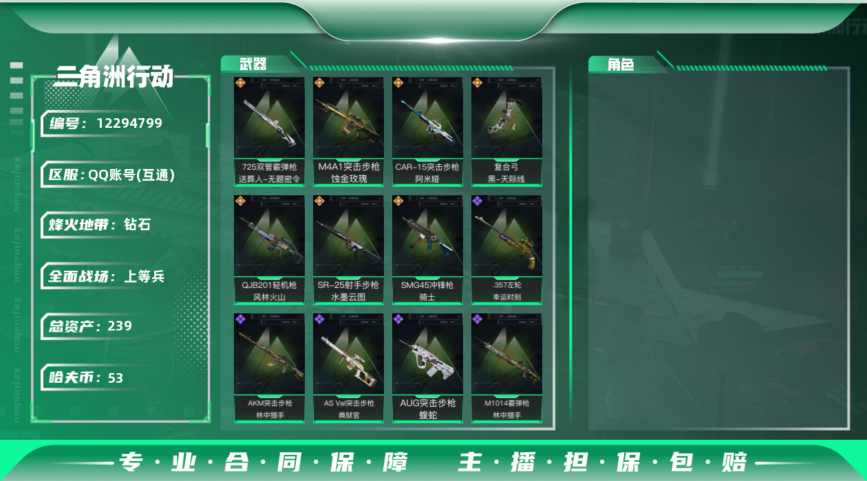 [12294799]总资产:239.5 7传说枪械 顶级安全箱(9.17到期) 可二次 可修改实名 烽火地带段位:钻石 全面战场段位:上等兵 哈夫币:53.282 传说武器皮肤:QJB201轻机枪-风林火山,SR-25射手步枪-水墨云图,SMG45冲锋枪-骑士,复合弓-黑-天际线,CAR-15突击步枪-阿米娅,725双管霰弹枪-送葬人-无题密令,M4A1突击步枪-蚀金玫瑰 史诗武器皮肤:SR-3M紧凑突击步枪-英雄,AUG突击步枪-蝮蛇,PKM通用机枪-蝮蛇,SR-25射手步枪-战场英杰,PKM通用机枪-荒野求生,MP5冲锋枪-深海恐惧,SR-3M紧凑突击步枪-荒野求生,勇士冲锋枪-深海恐惧,SG552突击步枪-深海恐惧,AKM突击步枪-林中猎手,.357左轮-幸运时刻,SVD狙击步枪-暗夜猎手,M16A4突击步枪-竞赛选手,SVD狙击步枪-荒野求生,M1014霰弹枪-林中猎手,SV-98狙击步枪-林中猎手,PTR-32突击步枪-英雄,PSG-1射手步枪-无垢,AS Val突击步枪-典狱官,M250通用机枪-囚徒,SV-98狙击步枪-囚徒,腾龙突击步枪-无垢,MP7冲锋枪-无垢,QBZ95-1突击步枪-曙光,沙漠之鹰-曙光,SVD狙击步枪-阿萨拉工艺,PKM通用机枪-英雄,M700狙击步枪-竞技风