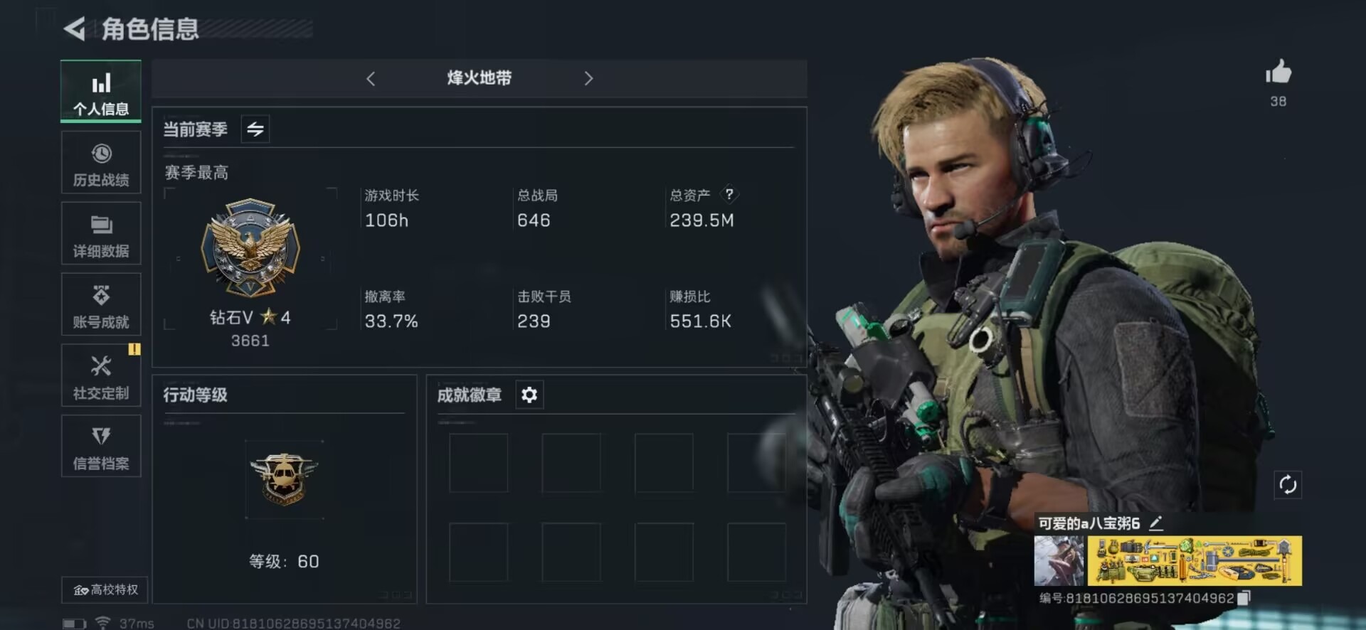 - [11604428]总资产:382.4M 1干员外观 1传说枪械 哈夫币:162K 高级安全箱(2×3)9.15号到期 可二次 可修改实名 烽火地带段位:钻石 全面战场段位:尉官 传说武器皮肤:M4A1突击步枪-阿米娅 史诗武器皮肤:M4A1突击步枪-竞技风 干员外观:蜂医-送葬人·无题密令(S5)