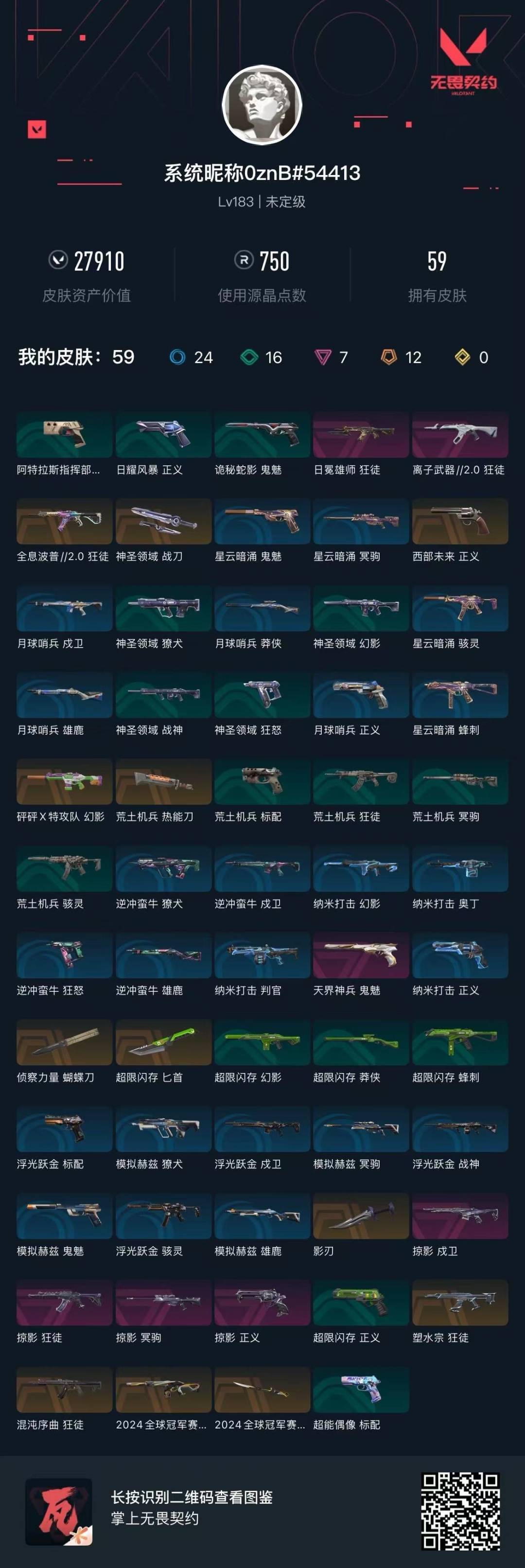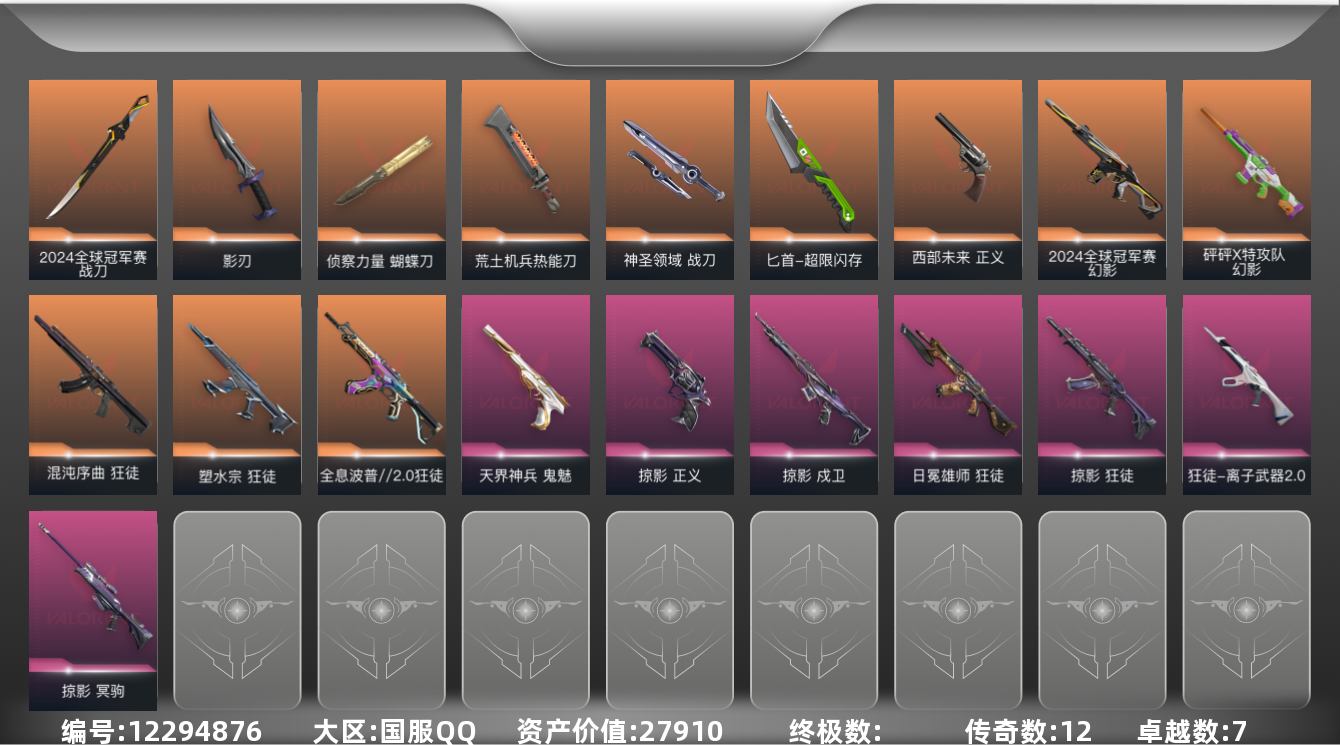 [12294876]12橙皮 7紫皮 59皮肤 24英雄 102卡面 750已用源晶 未定级 优质装备:掠影套装,2024全球冠军赛套装,狂徒-塑水宗,幻影-2024全球冠军赛,狂徒-混沌序曲,狂徒-掠影,幻影-砰砰X特攻队,狂徒-日冕雄师,狂徒-全息波普//2.0,正义-掠影,冥驹-掠影,戍卫-掠影,蝴蝶刀-侦察力量,鬼魅-天界神兵,匕首-超限闪存,影刃,荒土机兵热能刀,神圣领域 战刀 亮点皮肤:战刀-2024全球冠军赛 佩枪皮肤:正义-西部未来 步枪皮肤:狂徒-离子武器2.0