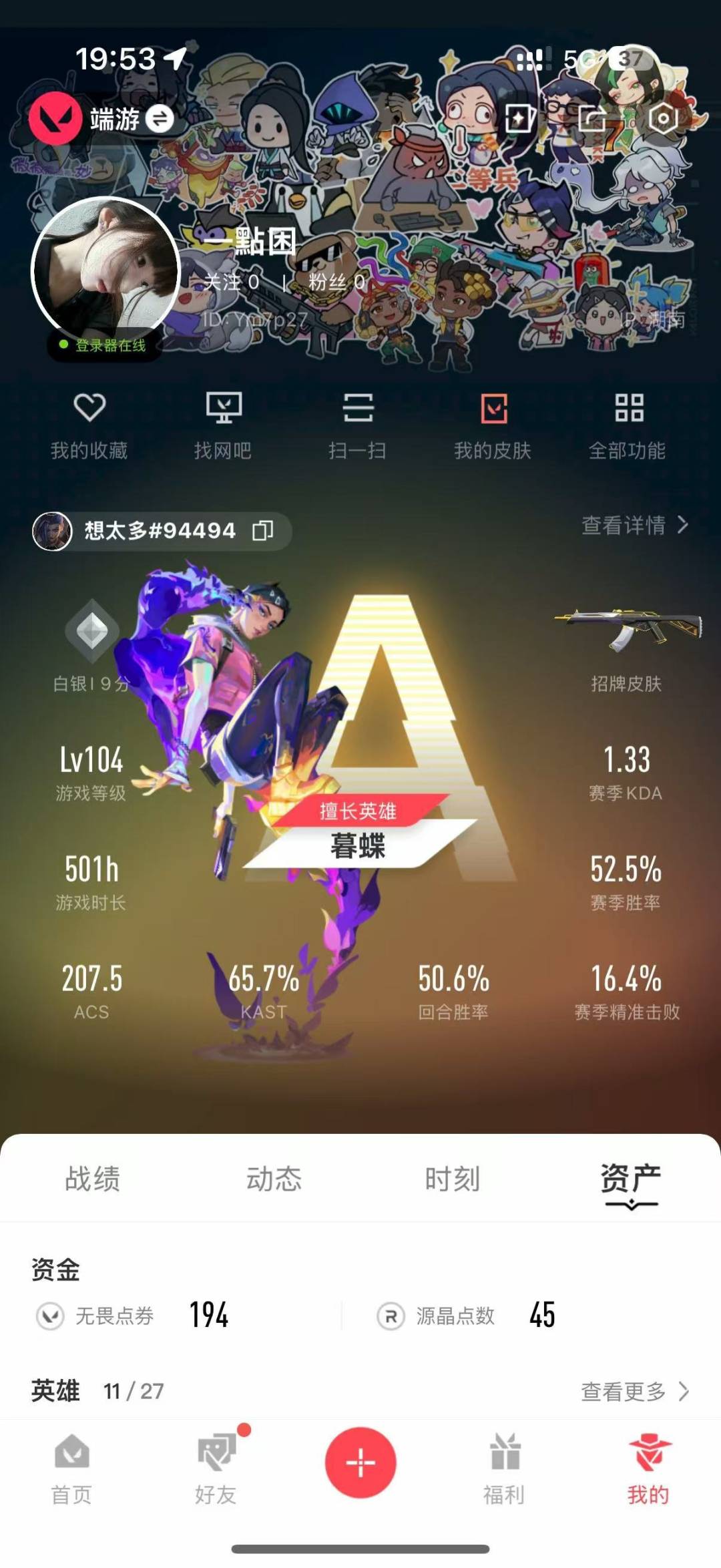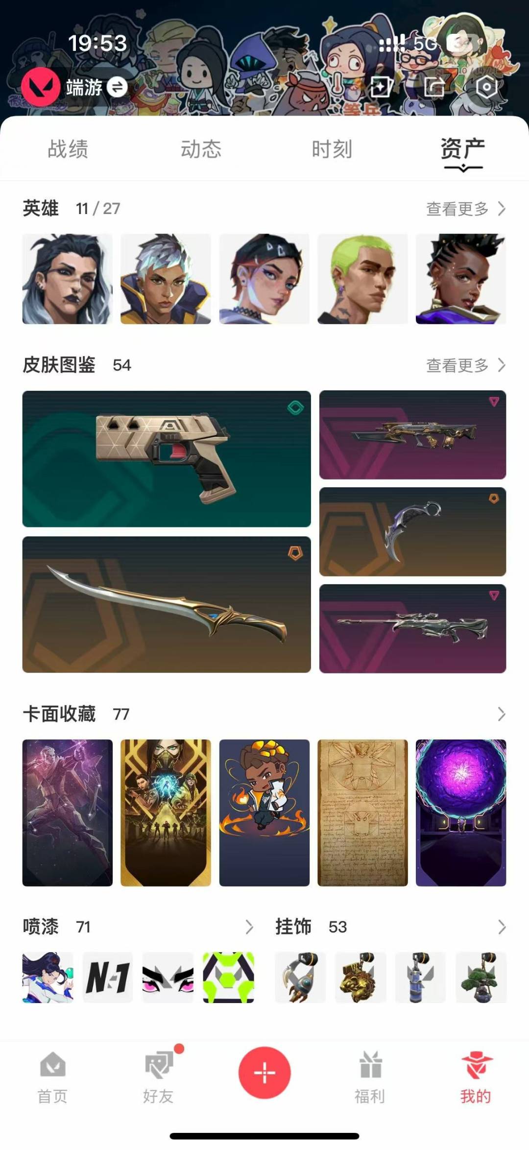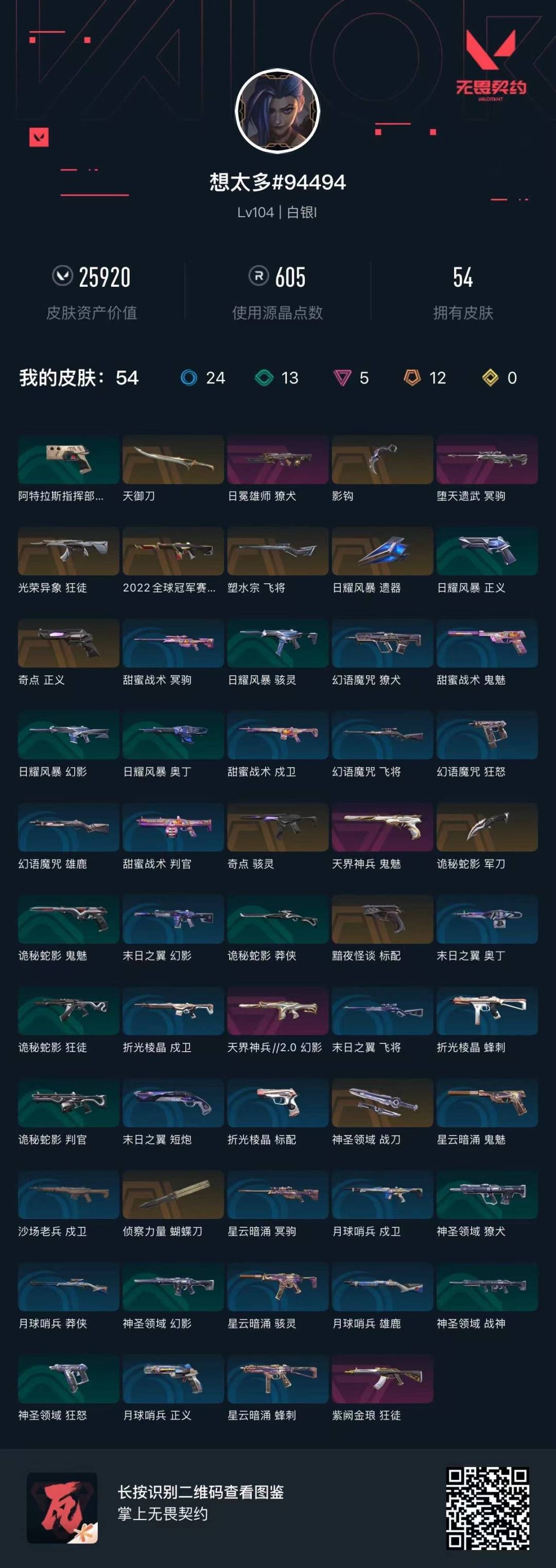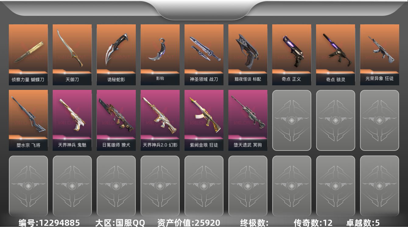 [12294885]12橙皮 5紫皮 54皮肤 11英雄 77卡面 605已用源晶 未定级 优质装备:正义-奇点,狂徒-紫阙金琅,冥驹-堕天遗武,幻影-天界神兵2.0,骇灵-奇点,蝴蝶刀-侦察力量,鬼魅-天界神兵,飞将-塑水宗,天御刀,神圣领域 战刀,诡秘蛇影,影钩,獠犬-日冕雄师 佩枪皮肤:标配-黯夜怪谈 步枪皮肤:狂徒-光荣异象