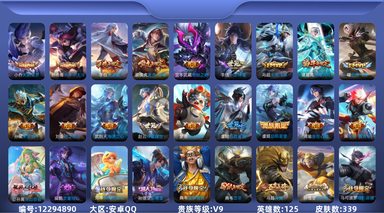- [11528610]无双贵族 5典藏 36传说 123英雄 354皮肤 典藏英雄武则天 可修改实名 优质装备:倪克斯神谕(宇宙婆娘),无限飓风号(高达),大秦宣太后,鸣剑·曳影,银白咏叹调(倪克斯侍卫),冠军飞将,绛天战甲(鸡嘴战神),猫影幻舞,久胜战神,末日机甲-孙尚香(绿蚂蚱),地狱火,仲夏夜之梦(大飞蛾),音你心动-小乔,零号·赤焰,海洋之心,地狱之眼,胖达荣荣,李逍遥,乞巧织情,时之恋人-刘备(电焊工),游龙清影(小青龙),超时空战士-狄仁杰,花朝如约(花篮子),山海·炽霜斩(李信年限),山海·琳琅生(小乔年限),山海·苍雷引(电光曜子),艾琳觅芳踪 珍宝阁皮:优雅恋人,玩趣恶龙 限定皮:至尊宝,太华(伽罗年限),异界灵契(白毛香),傲雪梅枪,补天,寅虎·展翼(孙膑年限),白鹤梁神女,白晶晶,时雨天司(水龙头),神威(电光马子),玄嵩(庄周年限),山海·碧波行(瑶年限),遇见飞天,高山流水,齐天大圣,匿光决锋者,五谷丰年,武圣,天狼运算者,游园惊梦,御风骁将(吕布年限),天狼溯光者,奔雷神使(牛魔年限),祈雪灵祝(雪兔子),天狼绘梦者,李小龙,逐梦之影,如梦令-嫦娥,如梦令-后羿,霸王别姬-项羽,霸王别姬-虞姬,孙行者,猪悟能,一生所爱,天魔缭乱,青春决赛季,乒乒小将,蜜橘之夏,神奇女侠,匿光追影者,女儿国国王,寅虎·御盾(廉颇年限),寅虎·瑞焰(虎皮蛋子),寅虎·心曲(虎婆),寅虎·赤拳(老虎年限),时之祈愿-云中君,时之祈愿-瑶(瑶传限),百木心枪,玉兔公主,启示之音,无尽星芒,山海·玄木吟(马可年限) 史诗皮:紫霞仙子,苍穹之光,白龙吟,黄金分割率,特工魅影,千年之狐,永昼,江河有灵,魅语,无限星赏官,冰冠公主,偶像歌手,晚萤,暗夜猫娘,龙骑士(小龙虾),末日机甲-吕布,猫狗日记-孙策,时之恋人-孙尚香,乱世虎臣,节奏热浪,修罗,女仆咖啡,摇滚巨星,水果甜心,绅士熊喵,天才门将,星夜王子,心灵骇客,时之奇旅-安琪拉,功夫厨神,德古拉伯爵,暗隐猎兽者,幽灵船长,鬼剑武藏,心灵战警,天秀·启明,舞动绿茵,地狱岩魂,纤云弄巧,繁星吟游(呼啦呼啦),拒霜思,缤纷独角兽,乘风破浪,逐浪之夏,水晶猎龙者,曙光守护者,金属风暴,圣诞狂欢,圣诞恋歌,鹰眼统帅,魅力维加斯,黎明之约,赏金猎手,奇遇舞章,天秀·音浪,寅虎·御盾,千筹问战,无心,未来纪元-赵云