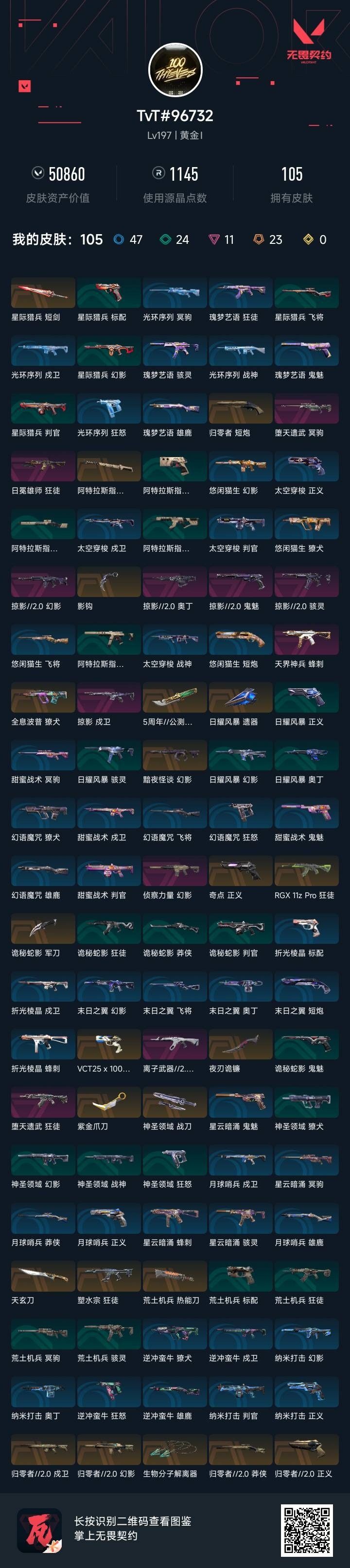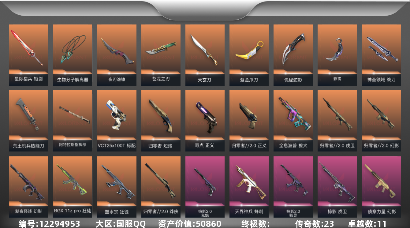 [12294953]23橙皮 11紫皮 105皮肤 26英雄 125卡面 1145已用源晶 黄金 优质装备:正义-奇点,狂徒-塑水宗,幻影-侦察力量,冥驹-堕天遗武,狂徒-日冕雄师,幻影-黯夜怪谈,戍卫-掠影,天玄刀,紫金爪刀,獠犬-全息波普,夜刃诡镰,荒土机兵热能刀,生物分子解离器,神圣领域 战刀,诡秘蛇影,苍龙之刃,阿特拉斯指挥部,影钩,星际猎兵 短剑 套装:掠影2.0套装,归零者//2.0套装 佩枪皮肤:标配-VCT25x100T,正义-归零者//2.0,鬼魅-掠影2.0,短炮-归零者 冲锋枪皮肤:骇灵-掠影2.0,蜂刺-天界神兵 步枪皮肤:戍卫-归零者//2.0,幻影-归零者//2.0,幻影-掠影2.0,RGX 11z pro 狂徒,狂徒-离子武器2.0,狂徒-堕天遗武 狙击枪皮肤:莽侠-归零者//2.0 机枪皮肤:奥丁-掠影2.0