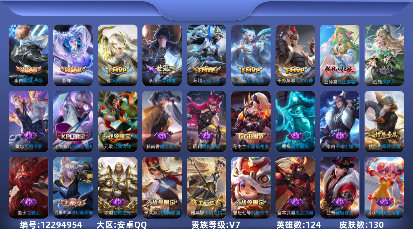 [12294954]V7 2典藏 5传说 124英雄 130皮肤 可修改实名 优质装备:鸣剑·曳影,幻阙歌(貂蝉典藏),久胜战神,炽阳神光,一念神魔,游龙清影(小青龙),无双飞将,涂山容容 限定皮:天狼溯光者,天狼绘梦者 史诗皮:百相守梦-黄忠,织梦人,苍穹之光,千年之狐,龙骑士(小龙虾),冰冠公主,偶像歌手,暗夜猫娘,时之恋人-孙尚香,天才门将,功夫厨神,幽灵船长,鬼剑武藏,地狱岩魂,缤纷独角兽,逐浪之夏,水晶猎龙者,原初追逐者,圣诞狂欢,圣诞恋歌,鹰眼统帅,王者之锤,魅力维加斯,黎明之约