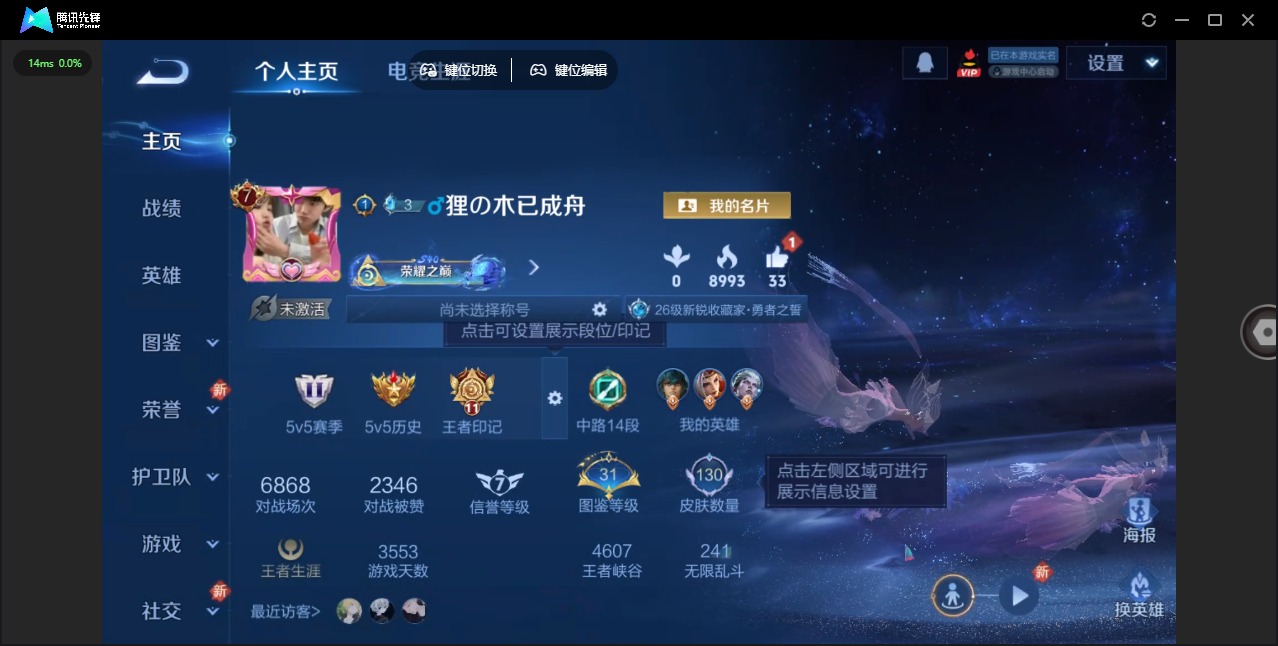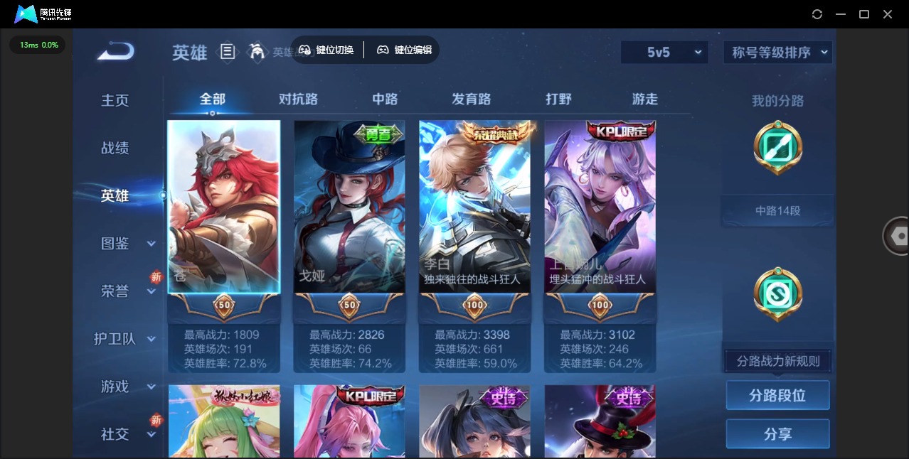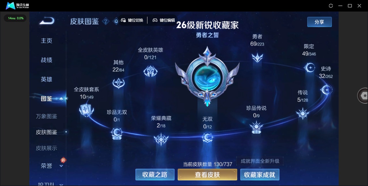 - PX_2071293-贵族等级: V8 英雄数: 123 皮肤数: 245 荣耀水晶: 鸣剑·曳影 星传说: 未来机甲 传说皮: 云鹰飞将,久胜战神,炽阳神光,一念神魔,末日机甲-孙尚香,时之恋人-刘备,淬星耀世,末日机甲-孙策,挚爱之约,无双飞将,山海·炽霜斩,浮生妄,记忆之芯,鹤羽星尊,妄想奇谈,惊梅引,霜月吟,乘龙·淬吴钩,幻光神枪 限定皮: 李小龙,御风骁将,武圣,岱宗,天狼狩猎者,美猴王