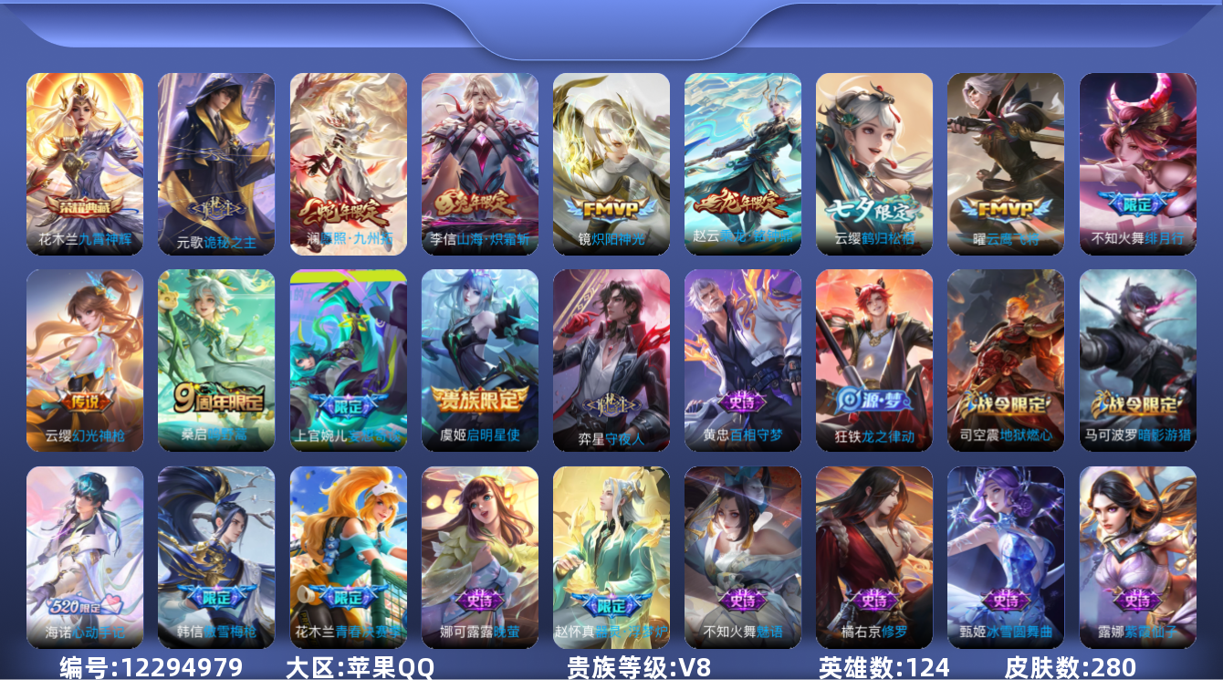 [12294979]V8 1典藏 12传说 124英雄 280皮肤 可修改实名 优质装备:九霄神辉(木兰典藏),云鹰飞将(小将军),炽阳神光,山海·炽霜斩(李信年限),妄想奇谈,鹤归松栖(云缨),诡秘之主 传说皮:乘龙·铭钟鼎(赵云年限),幻光神枪 珍宝阁皮:蔷薇恋人,玩趣恶龙 限定皮:愿照·九州拓(澜年限),逐霄战戟,鸣野蒿,傲雪梅枪,绯月行,五谷丰年,梁祝,李小龙,如梦令-后羿,青春决赛季,神器·万象笔 史诗皮:器灵·浮梦炉,星界战将,龙之律动,海诺心动手记,破空之剑,谪仙醉月,上官婉儿群星魔术团,守夜人,百相守梦-黄忠,紫霞仙子,苍穹之光,黄金分割率,特工魅影,千年之狐,永昼,电玩·爆裂旋风,江河有灵,百解令(蒙犽),蒙恬荣光圣徽,龙骑士(小龙虾),暗夜猫娘,魅语,无限星赏官,晚萤,末日机甲-吕布,猫狗日记-孙策,乱世虎臣,节奏热浪,修罗,女仆咖啡,摇滚巨星,水果甜心,星夜王子,心灵骇客,功夫厨神,德古拉伯爵,暗隐猎兽者,幽灵船长,鬼剑武藏,心灵战警,舞动绿茵,地狱岩魂,纤云弄巧,繁星吟游(呼啦呼啦),拒霜思,缤纷独角兽,乘风破浪,逐浪之夏,月团寄思,水晶猎龙者,曙光守护者,箭羽风息,金属风暴,原初追逐者,圣诞狂欢,圣诞恋歌,鹰眼统帅,魅力维加斯,赏金猎手,无心,未来纪元-赵云