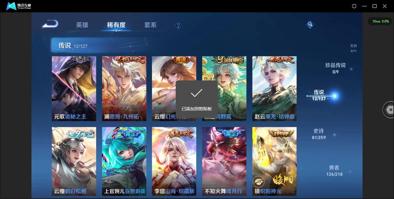 - [12106535]V8 1典藏 1珍品传说 12传说 122英雄 235皮肤 可修改实名 优质装备:鸣剑·曳影,怪盗基德,黄金射手座,久胜战神,炽阳神光,末日机甲-孙尚香(绿蚂蚱),山海·苍雷引(电光曜子),画中仙 珍宝阁皮:优雅恋人,女武神 限定皮:逐霄战戟,鸣野蒿,至尊宝,傲雪梅枪,白鹤梁神女,时雨天司(水龙头),神威(电光马子),高山流水,怒海麟威,冰锋战神,烈魂,祈雪灵祝(雪兔子),天狼绘梦者,李小龙,霸王别姬-虞姬,默契交锋-花木兰,猪悟能,一生所爱,青春决赛季,冰霜恋舞曲,蜜橘之夏,启示之音,山海·玄木吟(马可年限) 史诗皮:紫霞仙子,电玩小子(小书包),白龙吟,黄金分割率,特工魅影,魅语,冰冠公主,偶像歌手,晚萤,百相守梦(刘备),百相守梦(关羽),末日机甲-吕布,时之恋人-孙尚香,乱世虎臣,修罗,水果甜心,绅士熊喵,天才门将,功夫厨神,德古拉伯爵,幽灵船长,鬼剑武藏,地狱岩魂,纤云弄巧,繁星吟游(呼啦呼啦),拒霜思,缤纷独角兽,乘风破浪,逐浪之夏,月团寄思,金属风暴,原初追逐者,圣诞狂欢,圣诞恋歌,鹰眼统帅,暗夜贵公子,魅力维加斯,黎明之约,赏金猎手