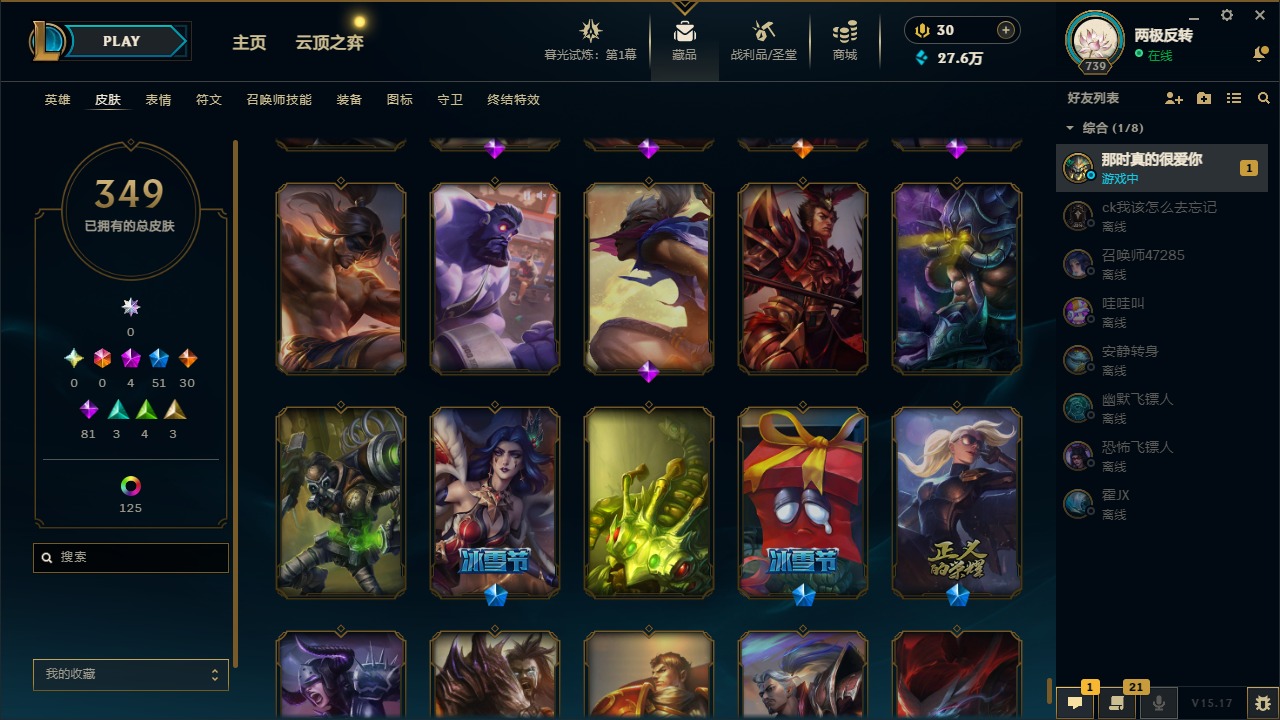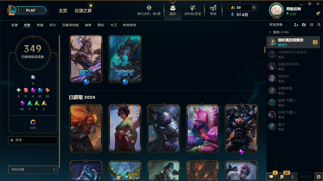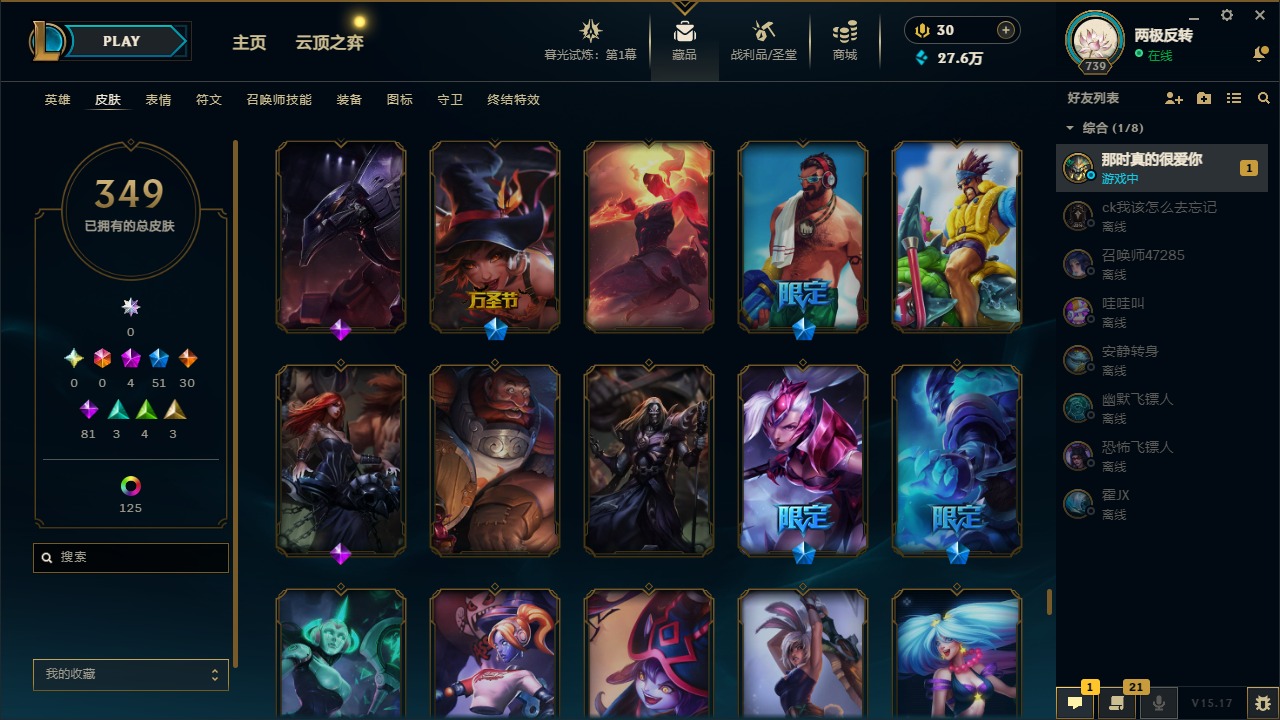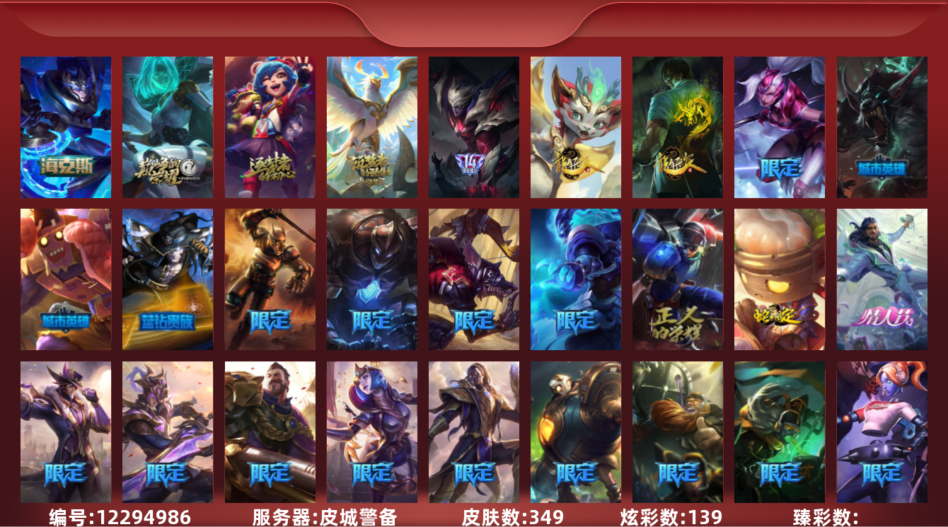 [12294986]4神话 51限定 30传说 81史诗 349皮肤 139炫彩 171英雄 可二次 可修改实名 优质装备:源代码 乐芙兰,防爆天使 凯尔,暗影 沃里克,都铎王朝 图奇,冠军典狱长 锤石,机械迷城 加里奥,警用试作体K-9 内瑟斯,蓝色忧郁 崔斯特,蒙多蒙多,勇者 奈德丽,玉剑传说 苍鸾 丁香,无畏骑士 瑟庄妮 赤子初心,可爱可爱粉红红 布里茨,玉剑传说 神机花火 青竹,净雪之月 莫甘娜 冬虹,星之守护者 奥莉安娜 未来之光,魔女 阿卡丽 虚荣,暗裔英雄 盖伦 海克斯:海克斯 嘉文四世 情人节限定:水晶玫瑰 阿克尚 赛季限定皮:胜利之运 崔斯特,胜利剑圣 易,胜利枪神 格雷福斯,胜利女神 奥利安娜,胜利枪神 卢锡安,胜利机器人 布里茨 冠军限定系列:S1FNC 酒桶,S1FNC 卡尔萨斯,S2 暗杀星 发条,S2 暗杀星 蒙多,S2 暗杀星 努努,S2 暗杀星 慎,S4 SSW 图奇,S4 SSW 炼金 冰雪节限定:“主人不要我了” 阿木木,冰雪风暴 希维尔,冰雪节 马尔扎哈,魄罗骑士 瑟庄妮,圣诞捣蛋鬼 金克丝,圣诞狂欢 时光,圣诞狂欢 努努,圣诞老人 酒桶,圣诞玩偶 波比,圣诞驯鹿 克格莫,幸福女神 乐芙兰,雪默丁格,雪装 奈德丽,北极星使者 沃里克 泳池派对:泳池派对 吉格斯,泳池派对 男枪,泳池派对 厄运小姐,泳池派对 李青 万圣节限定:鬼影重重 魔腾,海贼 瑞兹,灵魂收割者 索拉卡,魅惑女巫 奈德丽,南瓜头 费德提克,无头骑士 人马 年限:点心宝贝 阿木木,天龙之子 斯莫德,龙年 李青 周年:10周年 安妮,10周年 凤凰
