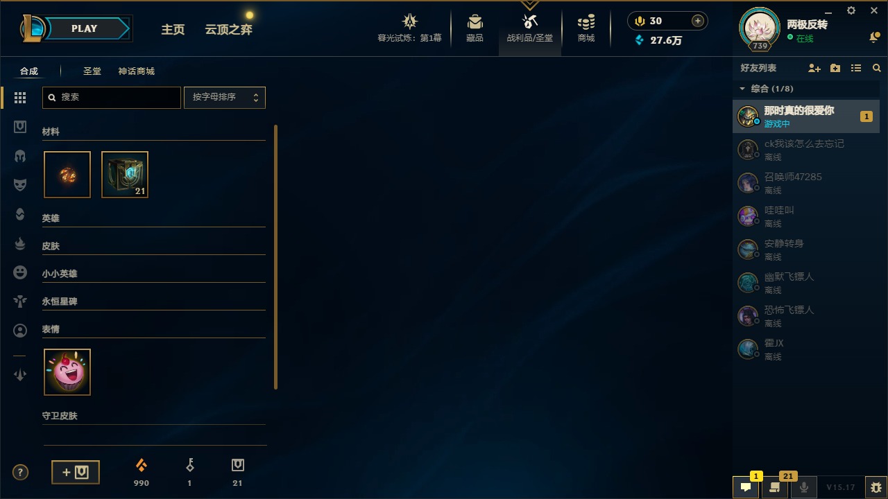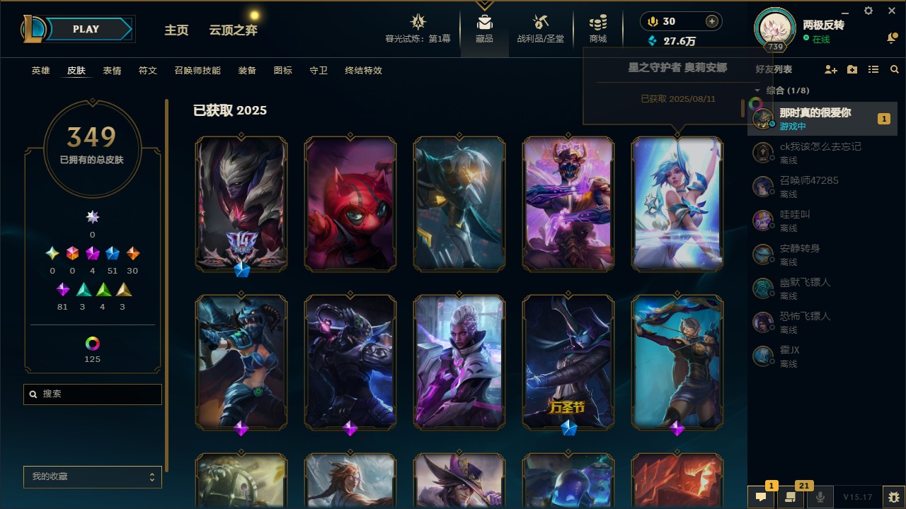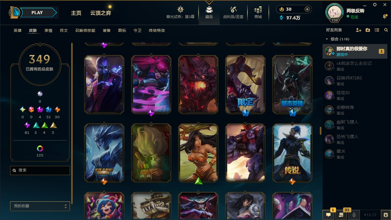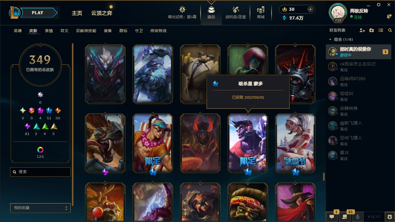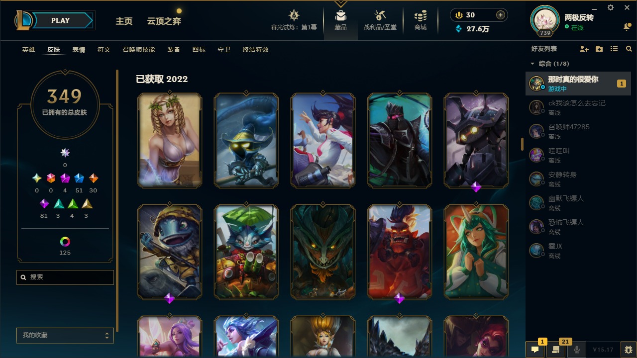 [12294986]4神话 51限定 30传说 81史诗 349皮肤 139炫彩 171英雄 可二次 可修改实名 优质装备:源代码 乐芙兰,防爆天使 凯尔,暗影 沃里克,都铎王朝 图奇,冠军典狱长 锤石,机械迷城 加里奥,警用试作体K-9 内瑟斯,蓝色忧郁 崔斯特,蒙多蒙多,勇者 奈德丽,玉剑传说 苍鸾 丁香,无畏骑士 瑟庄妮 赤子初心,可爱可爱粉红红 布里茨,玉剑传说 神机花火 青竹,净雪之月 莫甘娜 冬虹,星之守护者 奥莉安娜 未来之光,魔女 阿卡丽 虚荣,暗裔英雄 盖伦 海克斯:海克斯 嘉文四世 情人节限定:水晶玫瑰 阿克尚 赛季限定皮:胜利之运 崔斯特,胜利剑圣 易,胜利枪神 格雷福斯,胜利女神 奥利安娜,胜利枪神 卢锡安,胜利机器人 布里茨 冠军限定系列:S1FNC 酒桶,S1FNC 卡尔萨斯,S2 暗杀星 发条,S2 暗杀星 蒙多,S2 暗杀星 努努,S2 暗杀星 慎,S4 SSW 图奇,S4 SSW 炼金 冰雪节限定:“主人不要我了” 阿木木,冰雪风暴 希维尔,冰雪节 马尔扎哈,魄罗骑士 瑟庄妮,圣诞捣蛋鬼 金克丝,圣诞狂欢 时光,圣诞狂欢 努努,圣诞老人 酒桶,圣诞玩偶 波比,圣诞驯鹿 克格莫,幸福女神 乐芙兰,雪默丁格,雪装 奈德丽,北极星使者 沃里克 泳池派对:泳池派对 吉格斯,泳池派对 男枪,泳池派对 厄运小姐,泳池派对 李青 万圣节限定:鬼影重重 魔腾,海贼 瑞兹,灵魂收割者 索拉卡,魅惑女巫 奈德丽,南瓜头 费德提克,无头骑士 人马 年限:点心宝贝 阿木木,天龙之子 斯莫德,龙年 李青 周年:10周年 安妮,10周年 凤凰