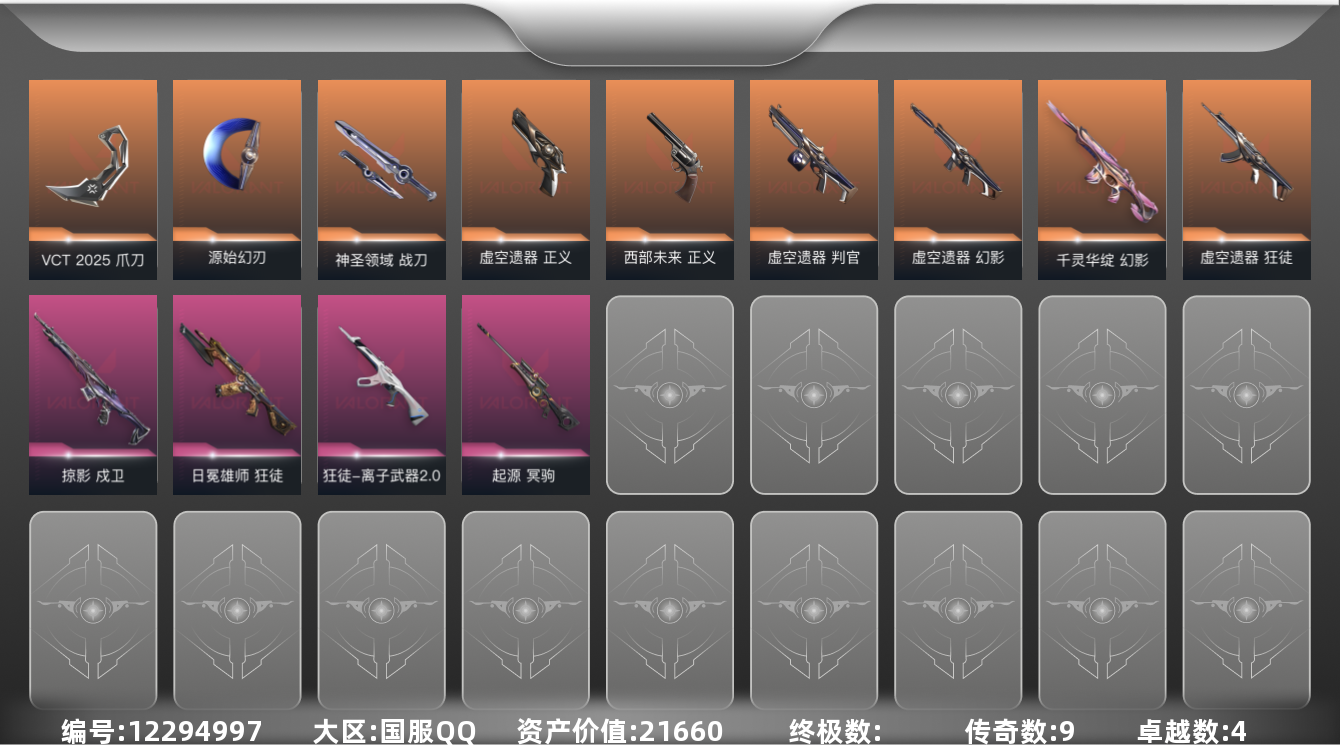 [12294997]9橙皮 4紫皮 36皮肤 16英雄 51卡面 440已用源晶 未定级 优质装备:幻影-千灵华绽,狂徒-日冕雄师,戍卫-掠影,冥驹-起源,神圣领域 战刀,VCT 2025 爪刀,源始幻刃 套装:虚空遗器,VCT 2025赛季礼包,VCTCN2025套装 佩枪皮肤:正义-虚空遗器,正义-西部未来 霰弹枪皮肤:判官-虚空遗器 步枪皮肤:狂徒-离子武器2.0,狂徒-虚空遗器,幻影-虚空遗器