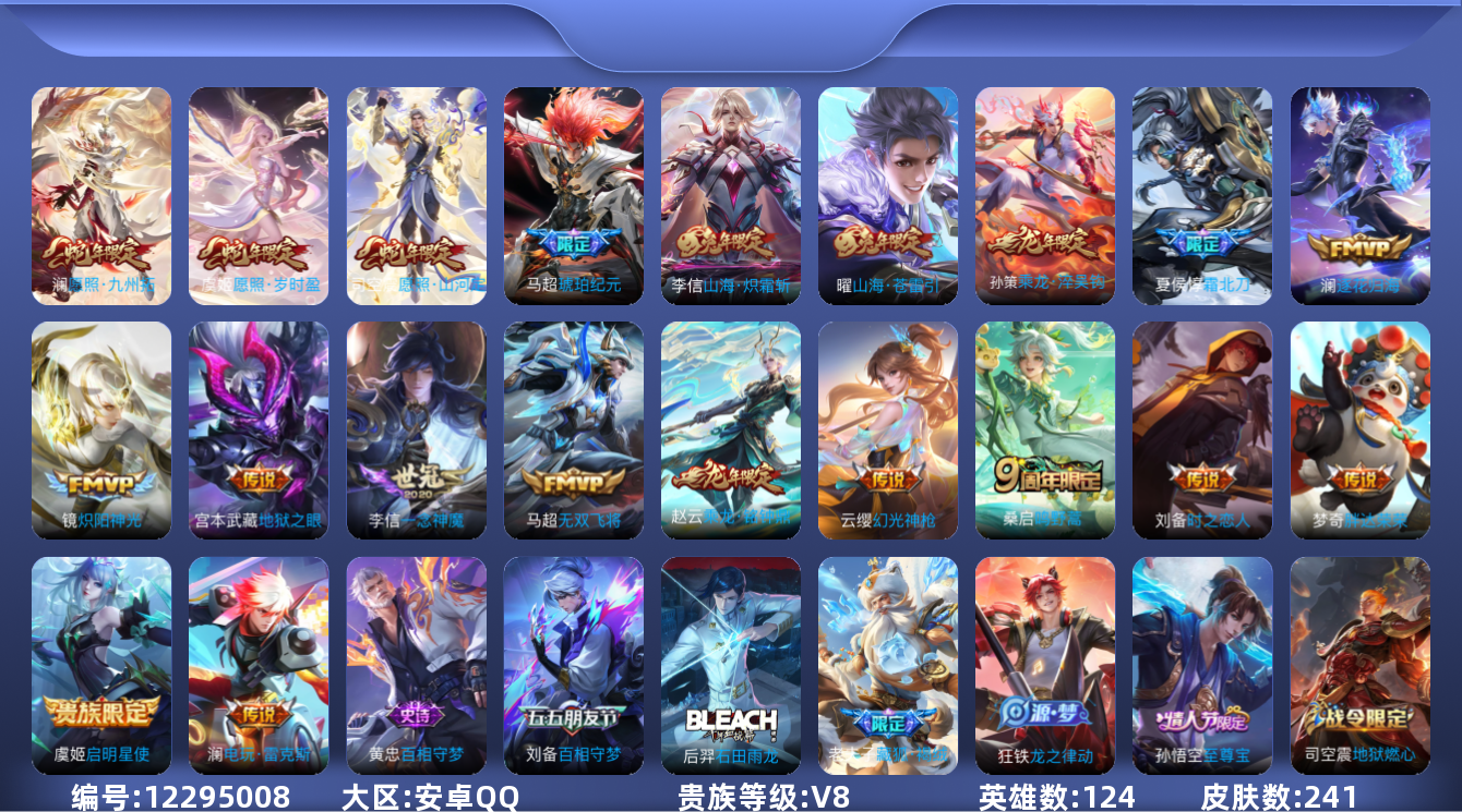 [12295008]V8 20传说 124英雄 241皮肤 可修改实名 优质装备:炽阳神光,一念神魔,地狱之眼,胖达荣荣,时之恋人-刘备(电焊工),无双飞将,山海·炽霜斩(李信年限),山海·苍雷引(电光曜子),电玩·雷克斯,澜逐花归海,琥珀纪元马超 传说皮:乘龙·铭钟鼎(赵云年限),乘龙·淬吴钩(孙策年限),幻光神枪 珍宝阁皮:妄想食味,蔷薇恋人 限定皮:愿照·九州拓(澜年限),愿照·岁时盈(虞姬年限),愿照·山河定(司空震年限),鸣野蒿,夏侯惇霜北刀,至尊宝,傲雪梅枪,降魔,五谷丰年,青龙志(铠年限),龙胆,烈魂,虎魄,百木心枪,山海·玄木吟(马可年限) 史诗皮:飞车小橘子,器灵·浮梦炉,星界战将,谪仙醉月,龙之律动,藏狐·褐绒,石田雨龙,茶境仙,破空之剑,超元猎域,百相守梦-百里守约,百相守梦-黄忠,紫霞仙子,黄金分割率,特工魅影,千年之狐,永昼,江河有灵,百解令(蒙犽),高渐离燃音魔法,蒙恬荣光圣徽,青蛇,百相守梦(刘备),末日机甲-吕布,猫狗日记-孙策,节奏热浪,修罗,水果甜心,绅士熊喵,天才门将,功夫厨神,德古拉伯爵,暗隐猎兽者,鬼剑武藏,暗渊魔法,心灵战警,乐园奇幻夜,地狱岩魂,纤云弄巧,拒霜思,缤纷独角兽,乘风破浪,逐浪之夏,水晶猎龙者,曙光守护者,箭羽风息,金属风暴,圣诞狂欢,圣诞恋歌,鹰眼统帅,魅力维加斯,赏金猎手,无心,未来纪元-赵云
