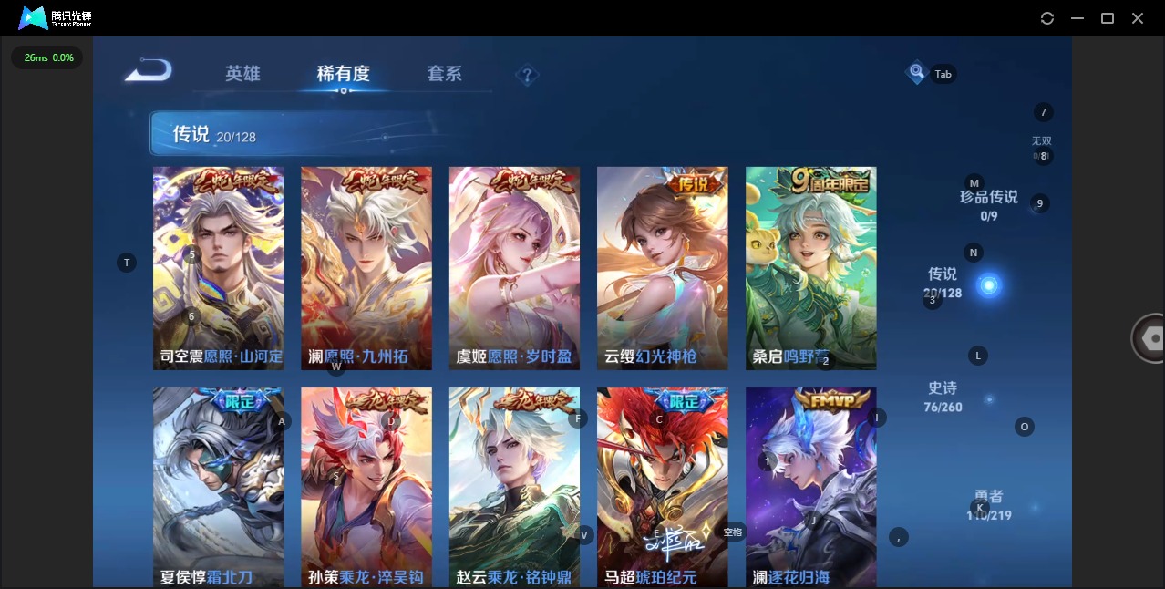- [11938770]V8 1典藏 19传说 123英雄 304皮肤 可修改实名 优质装备:鸣剑·曳影,冠军飞将,久胜战神,炽阳神光,末日机甲-孙尚香(绿蚂蚱),地狱之眼,时之恋人-刘备(电焊工),无双飞将,山海·炽霜斩(李信年限),山海·苍雷引(电光曜子),画中仙,浮生妄 传说皮:幻光神枪 珍宝阁皮:万物之道,优雅恋人,玩趣恶龙 限定皮:愿照·九州拓(澜年限),愿照·山河定(司空震年限),逐霄战戟,鸣野蒿,至尊宝,傲雪梅枪,时雨天司(水龙头),瑞麟志(木兰年限),高山流水,齐天大圣,五谷丰年,梁祝,李小龙,朱雀志(守约年限),孙行者,寅虎·赤拳(老虎年限),百木心枪,山海·玄木吟(马可年限) 史诗皮:鸭鸭历险记-刘禅,器灵·浮梦炉,绮世丹青,化蝶舞,星界战将,龙之律动,石田雨龙,茶境仙,破空之剑,蒙犽顽岩魄,芈月浮光幕影,海诺心动手记,琥珀纪元伽罗,蔬乡物语(鲁班七号),百相守梦-百里守约,百相守梦-黄忠,织梦人,紫霞仙子,黄金分割率,特工魅影,千年之狐,永昼,江河有灵,魅语,高渐离燃音魔法,蒙恬荣光圣徽,无限星赏官,冰冠公主,偶像歌手,晚萤,电玩·爆裂旋风,末日机甲-吕布,猫狗日记-孙策,猫狗日记-大乔,乱世虎臣,节奏热浪,修罗,女仆咖啡,摇滚巨星,水果甜心,绅士熊喵,星夜王子,功夫厨神,德古拉伯爵,暗隐猎兽者,幽灵船长,鬼剑武藏,暗渊魔法,心灵战警,天秀·启明,舞动绿茵,纤云弄巧,缤纷独角兽,乘风破浪,逐浪之夏,龙鼓争鸣,水晶猎龙者,曙光守护者,热力回旋,唤灵魅影,金属风暴,圣诞狂欢,圣诞恋歌,鹰眼统帅,魅力维加斯,赏金猎手,奇遇舞章,无心,未来纪元-赵云