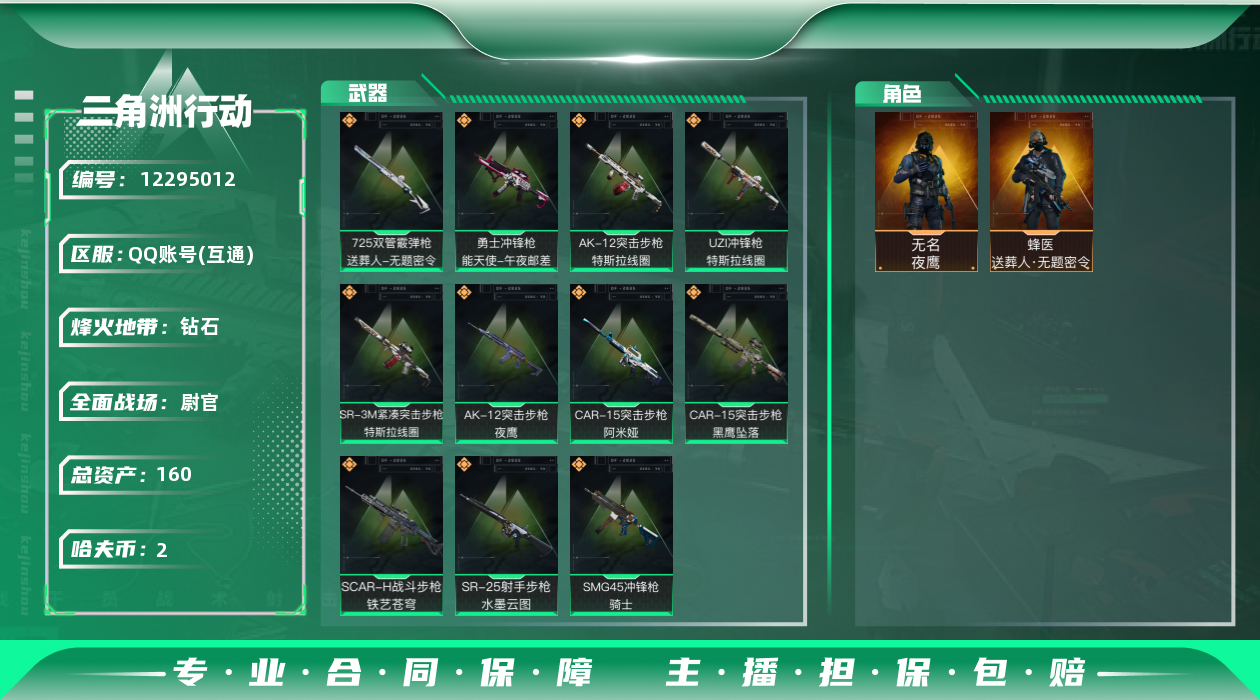 [12295012]总资产:160.6M 2干员外观 11传说枪械 哈夫币:2.066K 可二次 可修改实名 优质装备:顶级安全箱(3x3) 烽火地带段位:钻石 全面战场段位:尉官 传说武器皮肤:SR-25射手步枪-水墨云图,SCAR-H战斗步枪-铁艺苍穹,SMG45冲锋枪-骑士,UZI冲锋枪-特斯拉线圈,AK-12突击步枪-特斯拉线圈,SR-3M紧凑突击步枪-特斯拉线圈,勇士冲锋枪-能天使-午夜邮差,725双管霰弹枪-送葬人-无题密令,CAR-15突击步枪-阿米娅,AK-12突击步枪-夜鹰,CAR-15突击步枪-黑鹰坠落 干员外观:无名-夜鹰,蜂医-送葬人·无题密令(S5)