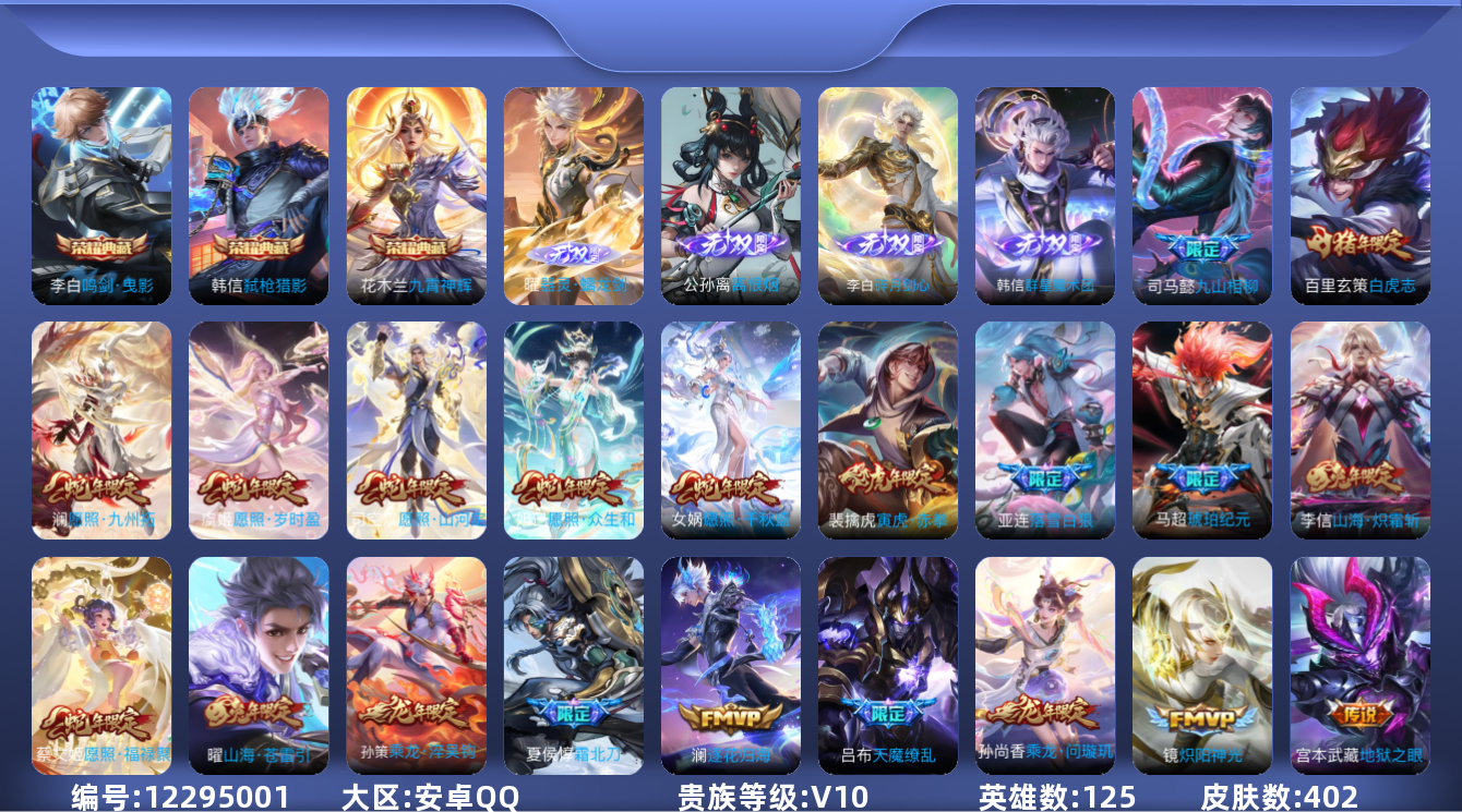 [12295001]V10 3典藏 4无双 50传说 125英雄 402皮肤 可修改实名 优质装备:鸣剑·曳影,九霄神辉(木兰典藏),弑枪猎影(韩信典藏),碎月剑心(李白无双),韩信群星魔术团(韩信无双),离恨烟(公孙离无双),器灵·螭龙剑,黄金狮子座,黄金射手座,冠军飞将,云鹰飞将(小将军),炽阳神光,一念神魔,云霓雀翎,末日机甲-孙尚香(绿蚂蚱),仲夏夜之梦(大飞蛾),地狱之眼,音你心动-周瑜,时之恋人-刘备(电焊工),游龙清影(小青龙),末日机甲-孙策,挚爱之约,无双飞将,山海·炽霜斩(李信年限),山海·琳琅生(小乔年限),山海·苍雷引(电光曜子),炽翼辉光(娃娃菜牛角包),画中仙,记忆之芯(机甲兔),鹤羽星尊,霜月吟,澜逐花归海,艾琳觅芳踪,琥珀纪元马超 传说皮:乘龙·问璇玑(孙尚香年限),乘龙·铭钟鼎(赵云年限),乘龙·淬吴钩(孙策年限),吕布曦玄引,落雪白狼,九山相柳,幻光神枪 珍宝阁皮:妄想食味,万物之道,蔷薇恋人,玩趣恶龙 限定皮:愿照·九州拓(澜年限),愿照·福禄聚(蔡文姬年限),愿照·岁时盈(虞姬年限),愿照·山河定(司空震年限),愿照·众生和(妲己年限),愿照·千秋盛(女娲年限),鸣野蒿,夏侯惇霜北刀,至尊宝,白虎志(电光耗子),武陵仙君(小桃花),神威(电光马子),飞衡(韩信年限),山海·碧波行(瑶年限),高山流水,诗剑行,五谷丰年,武圣,游园惊梦,梁祝,岱宗(典韦年限),李小龙,如梦令-后羿,圣诞老人,天魔缭乱,美猴王,匿光追影者,寅虎·赤拳(老虎年限),玉兔公主,启示之音,神器·万象笔,山海·玄木吟(马可年限),冰霜神祇 史诗皮:鸭鸭历险记-刘禅,糖绘人间,狼魂孤将,化蝶舞,灵蛊蚀心,龙之律动,石田雨龙,百相守梦-周瑜,茶境仙,幻珠鲛人,炽弈燎原,撼地雄心,破空之剑,涂山红红,东方月初,蒙犽顽岩魄,埋骨钱,海诺心动手记,琥珀纪元伽罗,蔬乡物语(鲁班七号),曹操夜都魔契,乘龙·聚宝船(安琪拉年限),乘龙·忆丹青(大乔年限),百相守梦-百里守约,百相守梦-黄忠,守夜人,紫霞仙子,苍穹之光,特工魅影,千年之狐,永昼,江河有灵,鹤归松栖(赵怀真),魅语,百解令(蒙犽),高渐离燃音魔法,蒙恬荣光圣徽,无限星赏官,冰冠公主,偶像歌手,晚萤,电玩·爆裂旋风,百相守梦(刘备),暗夜猫娘,龙骑士(小龙虾),末日机甲-吕布,猫狗日记-孙策,乱世虎臣,节奏热浪,修罗,女仆咖啡