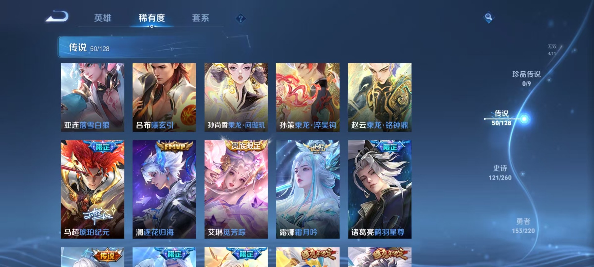 刘备时之恋人,赵云乘龙·铭钟鼎,干将莫邪画中仙,李信一念神魔,孙策末日机甲,孙策挚爱之约,孙策乘龙·淬吴钩,达摩黄金狮子座,孙尚香乘龙·问璇玑,露娜霜月吟,吕布曦玄引,镜炽阳神光,周瑜音你心动,公孙离记忆之芯,亚连落雪白狼,艾琳觅芳踪,西施游龙清影,曜云鹰飞将,马超琥珀纪元,马超无双飞将,澜逐花归海,虞姬云霓雀翎,云缨幻光神枪