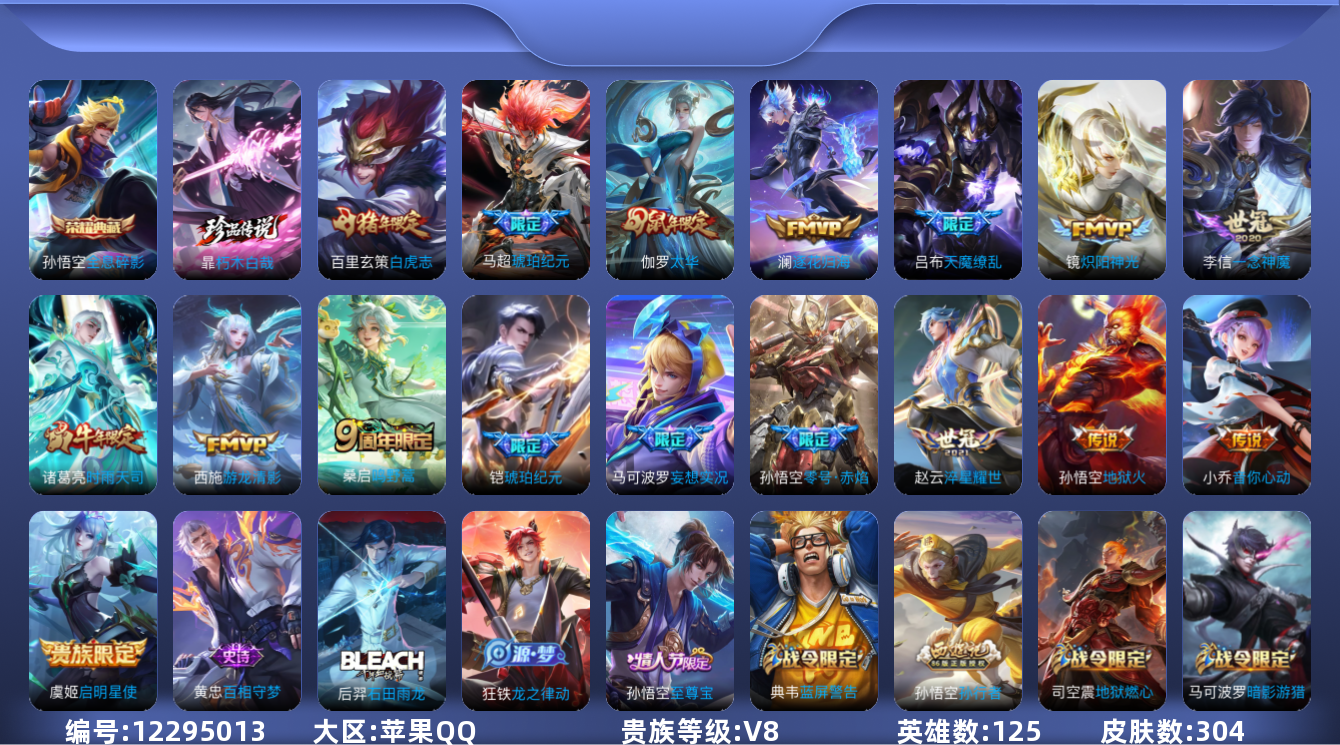 [12295013]V8 1典藏 1珍品传说 17传说 125英雄 304皮肤 可修改实名 优质装备:全息碎影(猴子典藏),朽木白哉,炽阳神光,一念神魔,地狱火,音你心动-小乔,零号·赤焰,游龙清影(小青龙),淬星耀世,妄想实况,澜逐花归海,琥珀纪元铠,琥珀纪元马超 珍宝阁皮:妄想食味,优雅恋人 限定皮:逐霄战戟,鸣野蒿,至尊宝,白虎志(电光耗子),太华(伽罗年限),时雨天司(水龙头),飞衡(韩信年限),五谷丰年,冰锋战神,游园惊梦,梁祝,天狼狩猎者,逐梦之星,天狼溯光者,天狼绘梦者,李小龙,逐梦之影,辉光之辰,如梦令-嫦娥,如梦令-后羿,孙行者,大圣娶亲,天魔缭乱,匿光追影者 史诗皮:星界战将,龙之律动,石田雨龙,琥珀纪元伽罗,蔬乡物语(鲁班七号),百相守梦-黄忠,苍穹之光,电玩小子(小书包),白龙吟,黄金分割率,特工魅影,千年之狐,江河有灵,雪夜绮愿(周瑜),百解令(蒙犽),高渐离燃音魔法,偶像歌手,暗夜猫娘,末日机甲-吕布,猫狗日记-孙策,乱世虎臣,节奏热浪,修罗,女仆咖啡,摇滚巨星,水果甜心,绅士熊喵,天才门将,星夜王子,心灵骇客,德古拉伯爵,暗隐猎兽者,幽灵船长,鬼剑武藏,心灵战警,舞动绿茵,地狱岩魂,纤云弄巧,繁星吟游(呼啦呼啦),拒霜思,缤纷独角兽,乘风破浪,逐浪之夏,龙鼓争鸣,水晶猎龙者,曙光守护者,箭羽风息,金属风暴,圣诞狂欢,圣诞恋歌,鹰眼统帅,魅力维加斯,黎明之约,未来纪元-赵云