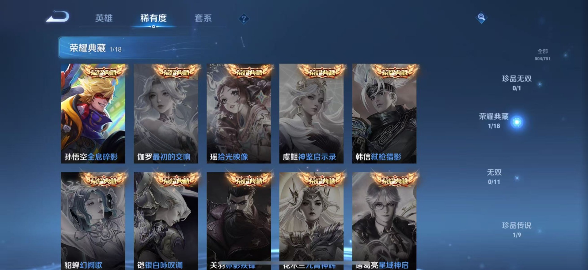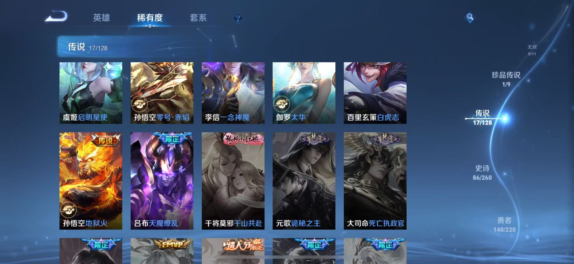 - PX_2025694-贵族等级: V8 英雄数: 124 皮肤数: 292 荣耀水晶: 九霄神辉,赤影疾锋 珍品传说: 怪盗基德,器灵·落星盏 传说皮: 云鹰飞将,黄金白羊座,久胜战神,一念神魔,地狱火,仲夏夜之梦,游龙清影,末日机甲-孙策,碎云,山海·炽霜斩,炽翼辉光,乘龙·问璇玑,乘龙·淬吴钩,典韦战鼓燎原 限定皮: 梁祝,时雨天司,辉光之辰,孙行者,时之奇旅-妲己,星穹之声,五谷丰年,降魔,