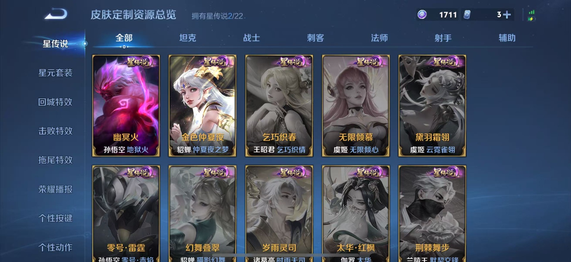 伽罗天狼溯光者,伽罗太华,后羿如梦令,后羿辉光之辰,镜匿光追影者,诸葛亮时雨天司,裴擒虎李小龙,裴擒虎天狼狩猎者,上官婉儿梁祝,上官婉儿天狼绘梦者,马可波罗逐梦之星,桑启鸣野蒿,孙悟空孙行者,孙悟空大圣娶亲,孙悟空至尊宝,百里玄策白虎志,韩信飞衡,韩信逐梦之影,嫦娥如梦令,关羽冰锋战神